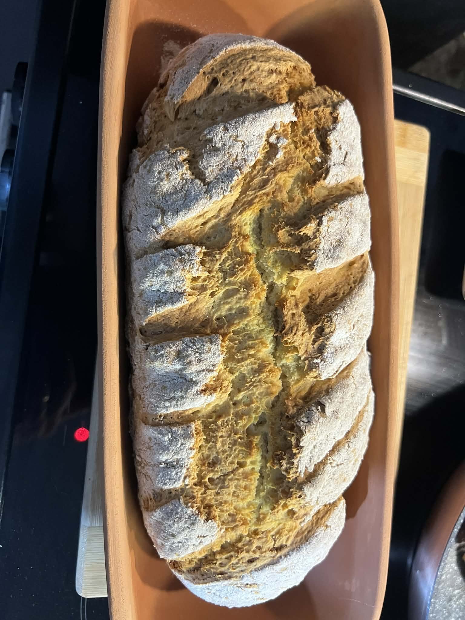 Съдът за печене е глинен, от "Земята на траките". Имат сайт, иначе ги има в МОЛ Сердика. Хлябът е по рецепта на Ирина Тенчева/стрина/, както я знаем във форума. Ирландски хляб, но си е содена питка,ако питате мен. Оформен като хляб ми харесва повече.