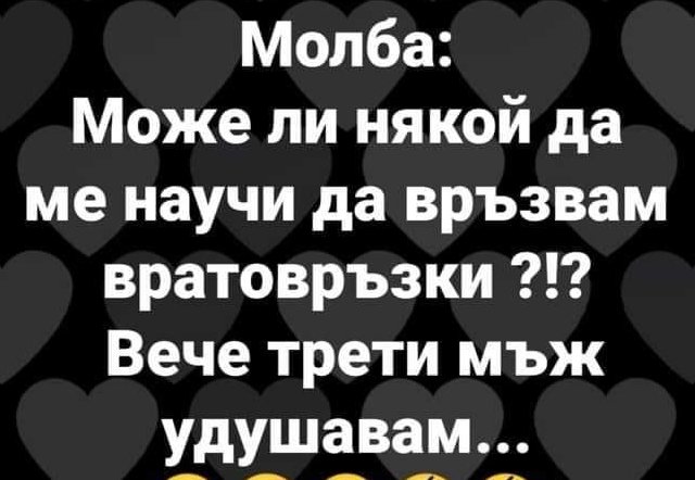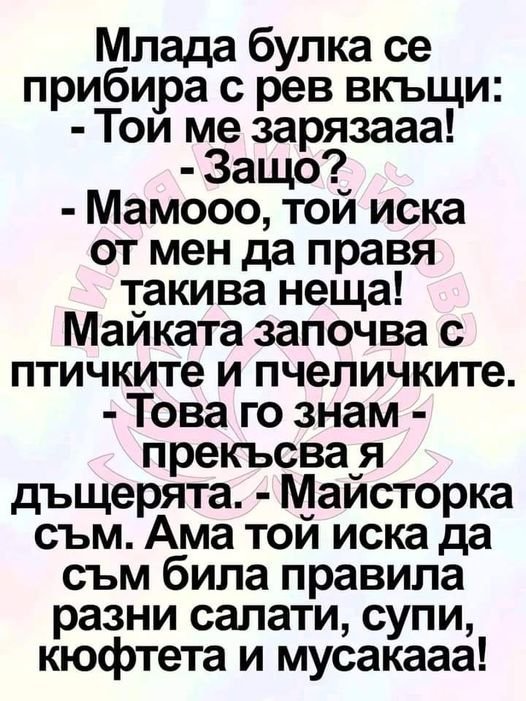 -И аз обявих на моя, че спирам да читя и готвя. Първа седмица не виждам нищо. Втора-седмица - не виждам нищо. На третата седмица успях да прогледна с едното око..... Joy
