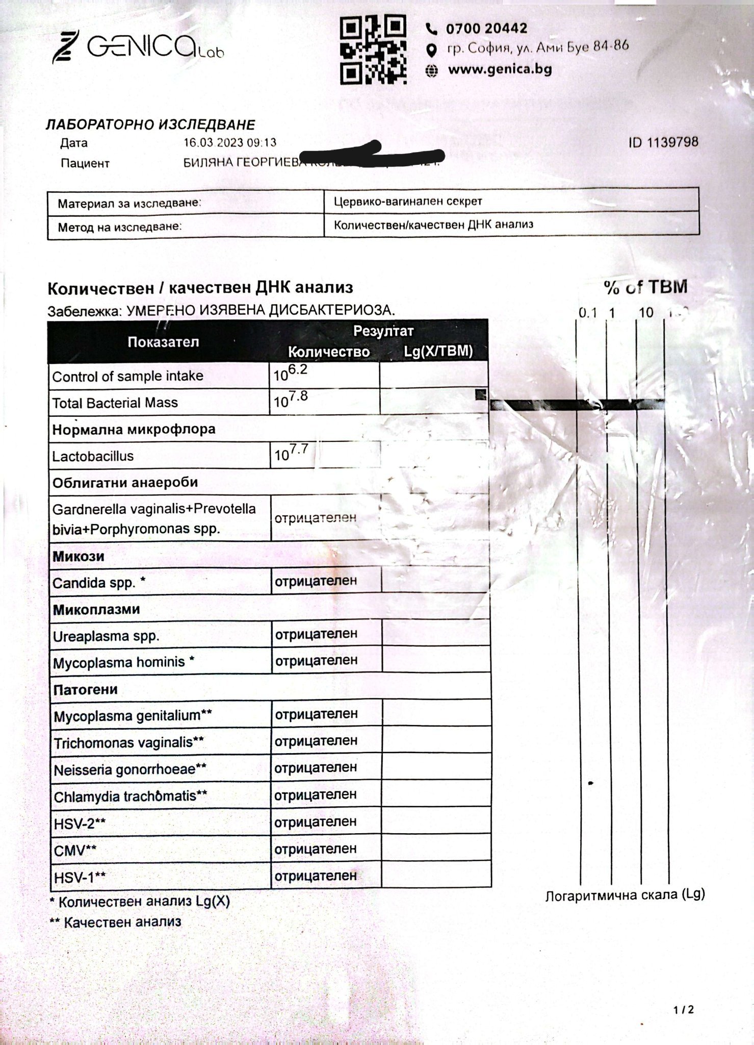 Благодаря за отговора. Ето поствам изследването от Геника, това НЦЗПБ няма да го поствам, защото там всичко е писано на ръка и не знам доколко ще се разчита тук. Иначе и там са пускани тези неща, плюс стандартни микробиологии, два пъти за трихомони само, че не чрез PSR, а по друг метод и да всичко беше отрицателно, което ми беше доста странно, защото точно тогава имах ужасно обилно течение и оплаквания от влагалишен дискомфорт. Другото което ми е откривано периодично в стерилна урина и влагалищен секрет са Е. коли, стафилококи, клебсиела и тем подобни банални бактерии, но невинаги когато съм имала оплаквания е хващано нещо, което ме навежда на мисълта, че може и да има от другите видове, за които ви обясних, а именно хламидия и плазмите..