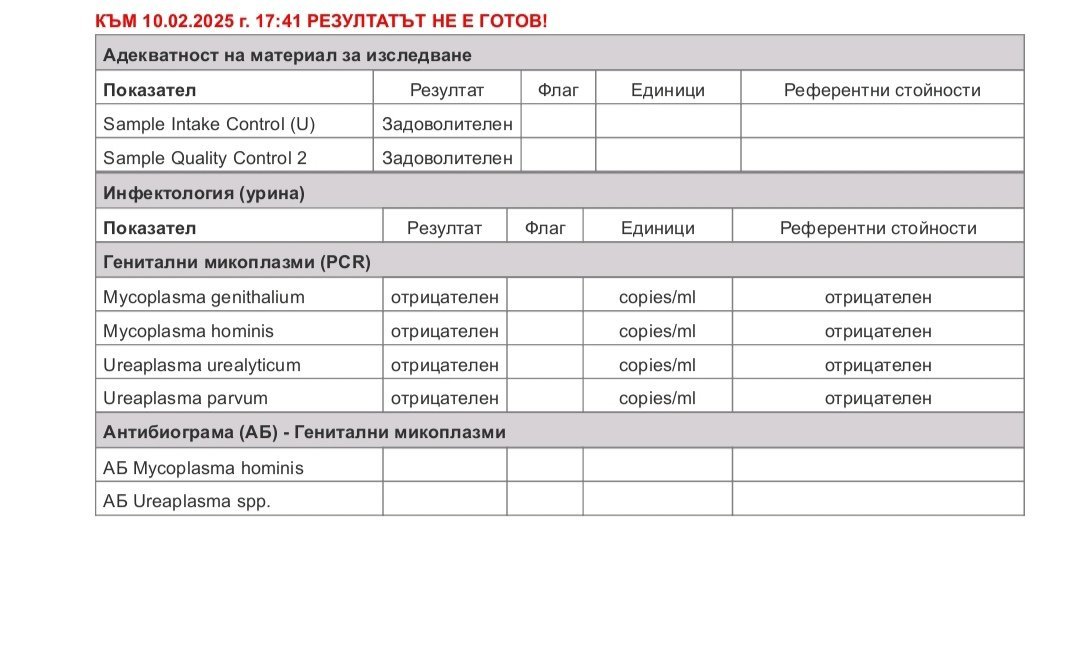 Без да цитирам конкретна лаборатория, аз също съм имала сходен резултат, в който без да е правен pcr тест пишеше, съмнения за микоплазмена и/или хламидийна инфекция. Аз лично не вярвам вече и на отрицателни PCR тестове. Специално за хламидии, те хващат само прясна инфекция.  Бих пуснала кръвен тест за хламидия - трите антигена и културелно за плазмите с антибиограма. Предвид че има налични симптоми, читав АГ може да предпише подходящо лечение, което да покрие и двете бактерии.
