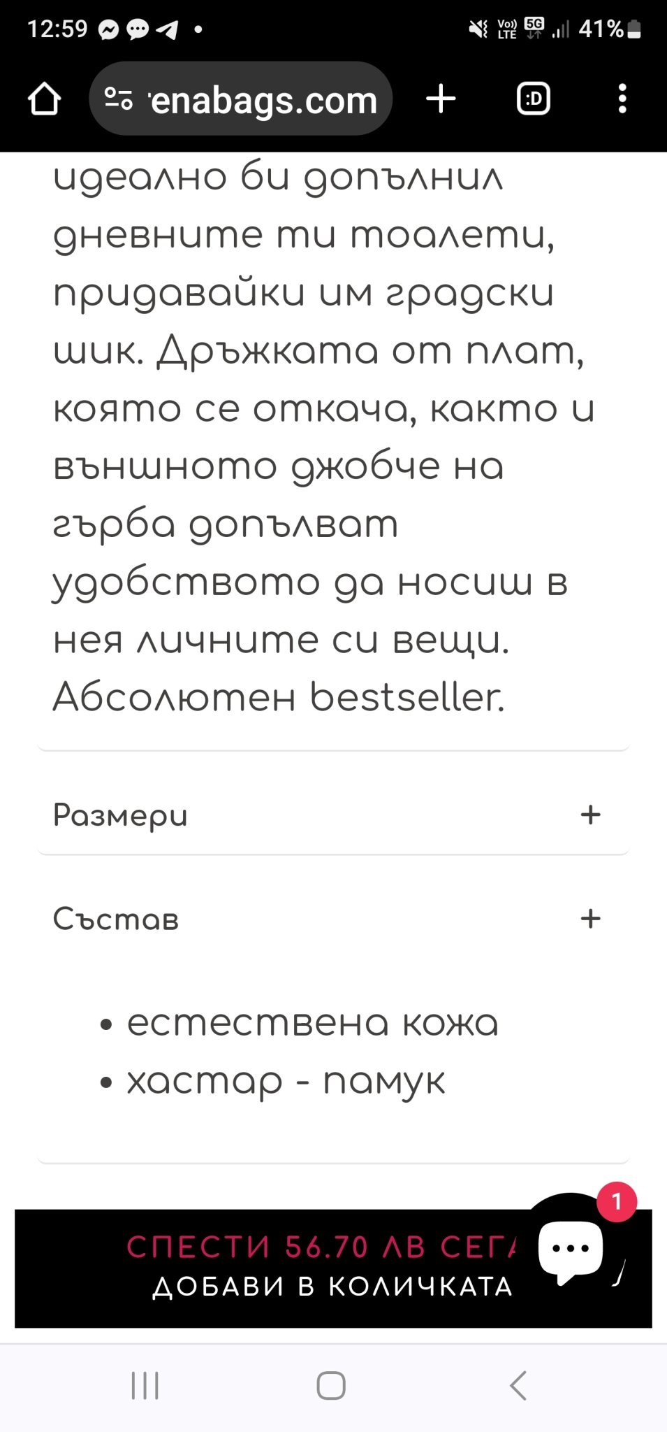 Зарена ме впечатлиха с естествената си кожа вътре и вън, пипнати са и за мен си заслужава цената. Аз една Галя съм пробвала дотук, нося си я с кеф като ежедневна. По черен петък я взимах за около 160 лв, не съм сигурна колко ѝ е ненамалената цена.