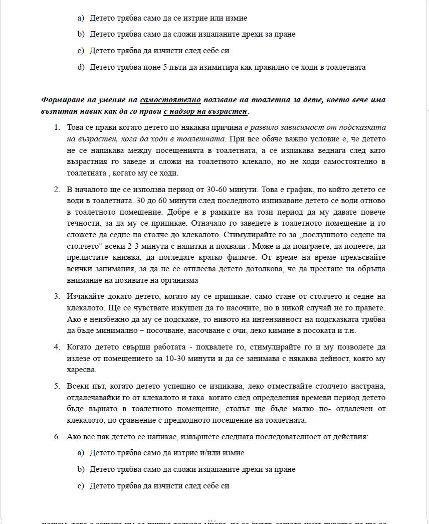 Затова и искам да дам пример за това как ние се отклонявахме от тази инструкция но пак постигнахме успех. Посещението на тоалетната в началото беше напълно невъзможно, помещението ни е малко и много шумно, а детето беше със СИД. Така че изпикаването не ставаше в тоалетната а в банята.