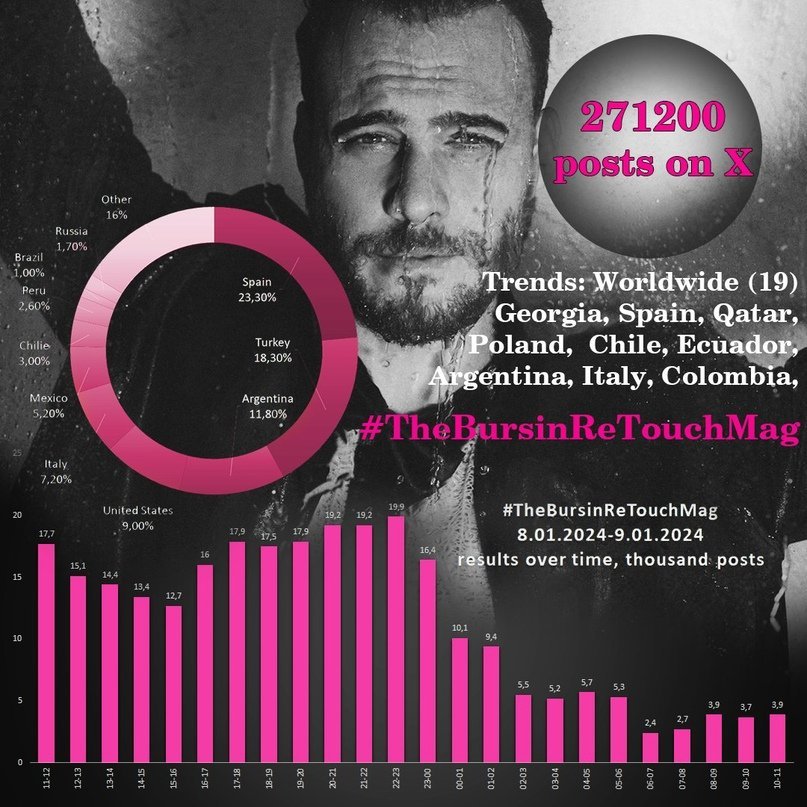 През деня от 11.00 часа на 8 януари 2024 г. 271 200 публикации в мрежата на X бяха маркирани с хаштаг #TheBursinReTouchMag! Най-много постове са написали фенове на Керем Бюрсин от Испания (23,3%), Турция (18,3%) и Аржентина (11,8%)!