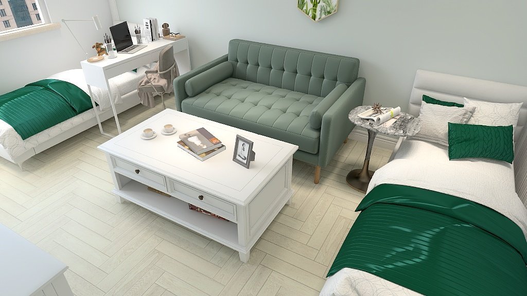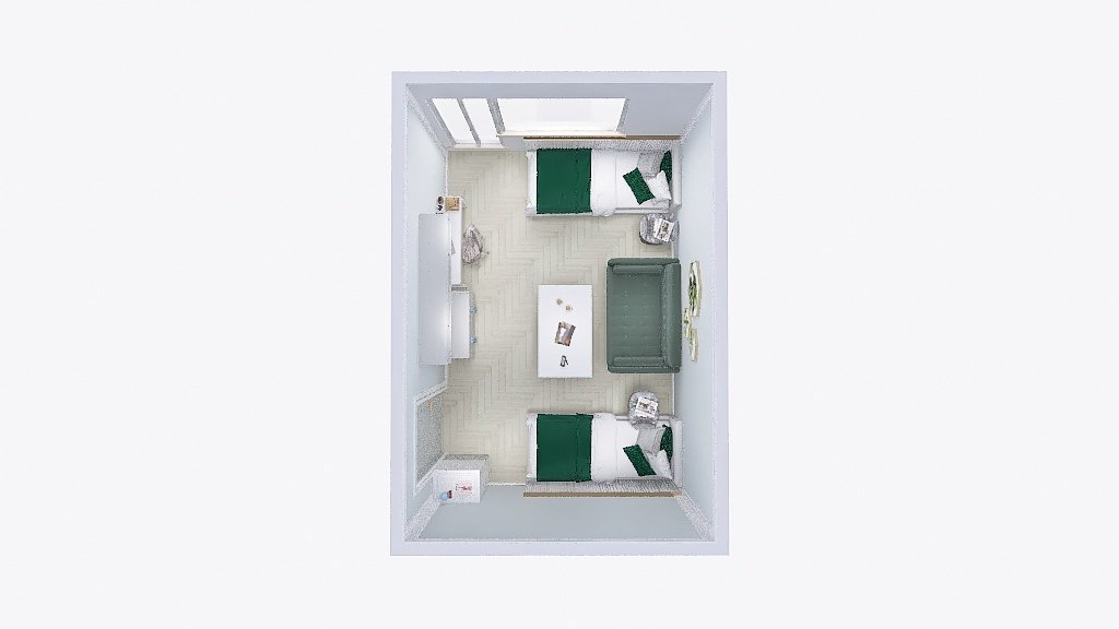 Иначе ми се иска да пробвам да сложа едно единично легло 95 х 20 там където е леглото на проекта, под прозореца, на срещуположната стена на прозореца ( където е бюрото ) друго легло 95 х 200. Между тях едно диванче 150м широко.