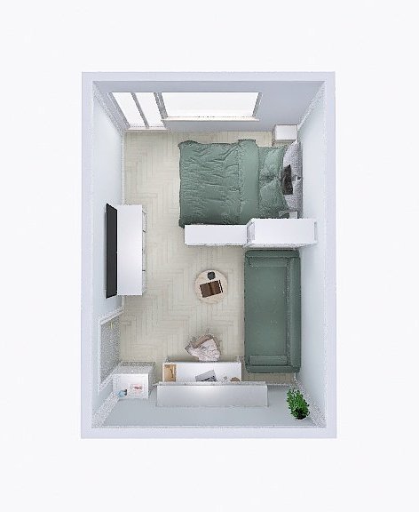Впрочем, ето едно възможно разпределение, със спалня за матрак 140/200, нощно шкафче 30/40 см, прав диван до 210 см и доста места за съхранение: