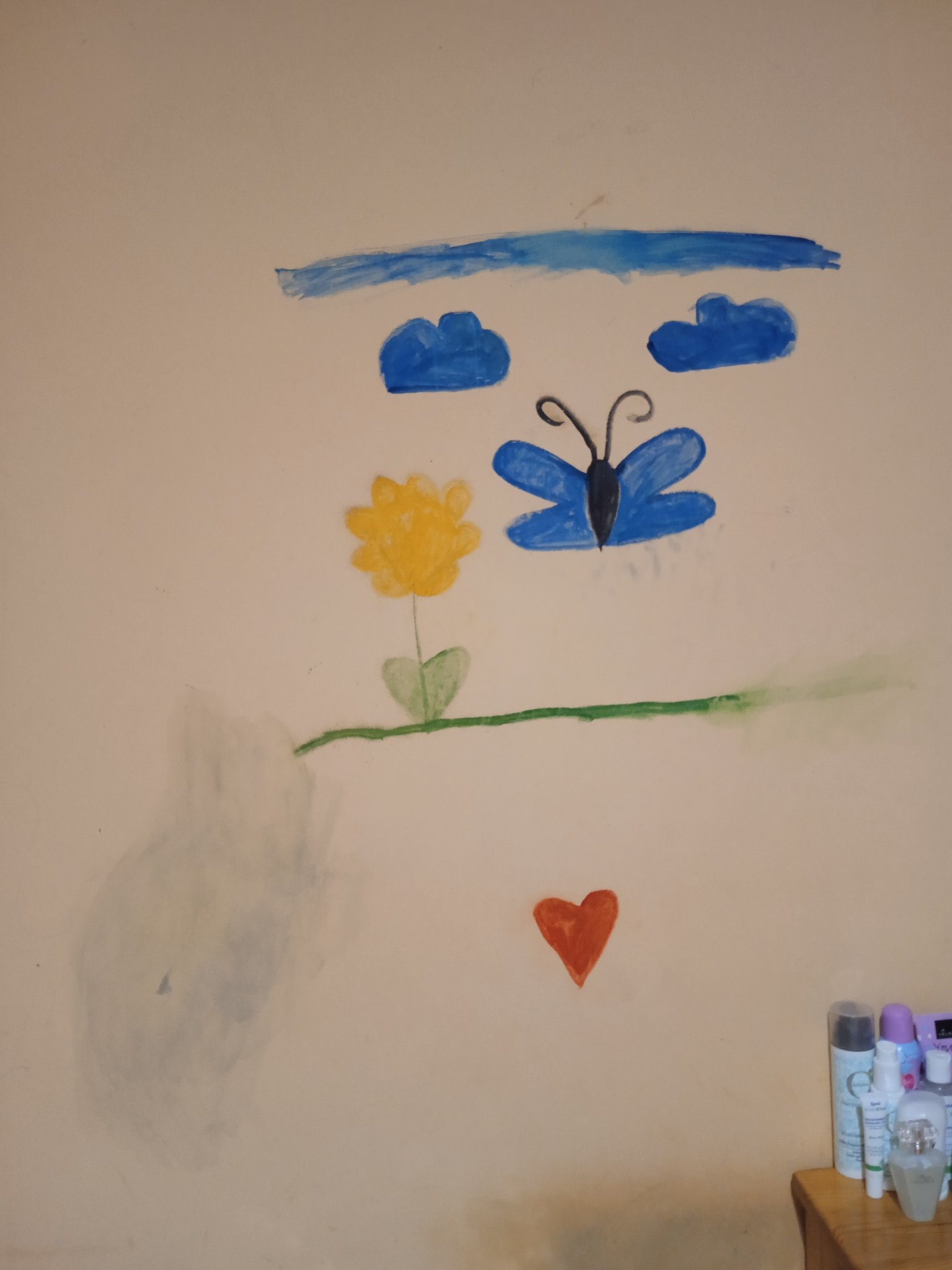 Това е рисунка на стена а боички,дъщеря ми беше по-малка рисува,сега иска да се махне,знам за варианта боя но скоро не обмислям такава,днес купих магическа гъба от ДМ така хеалените,е то се размаца има ли как да го изчистя да се заличи?