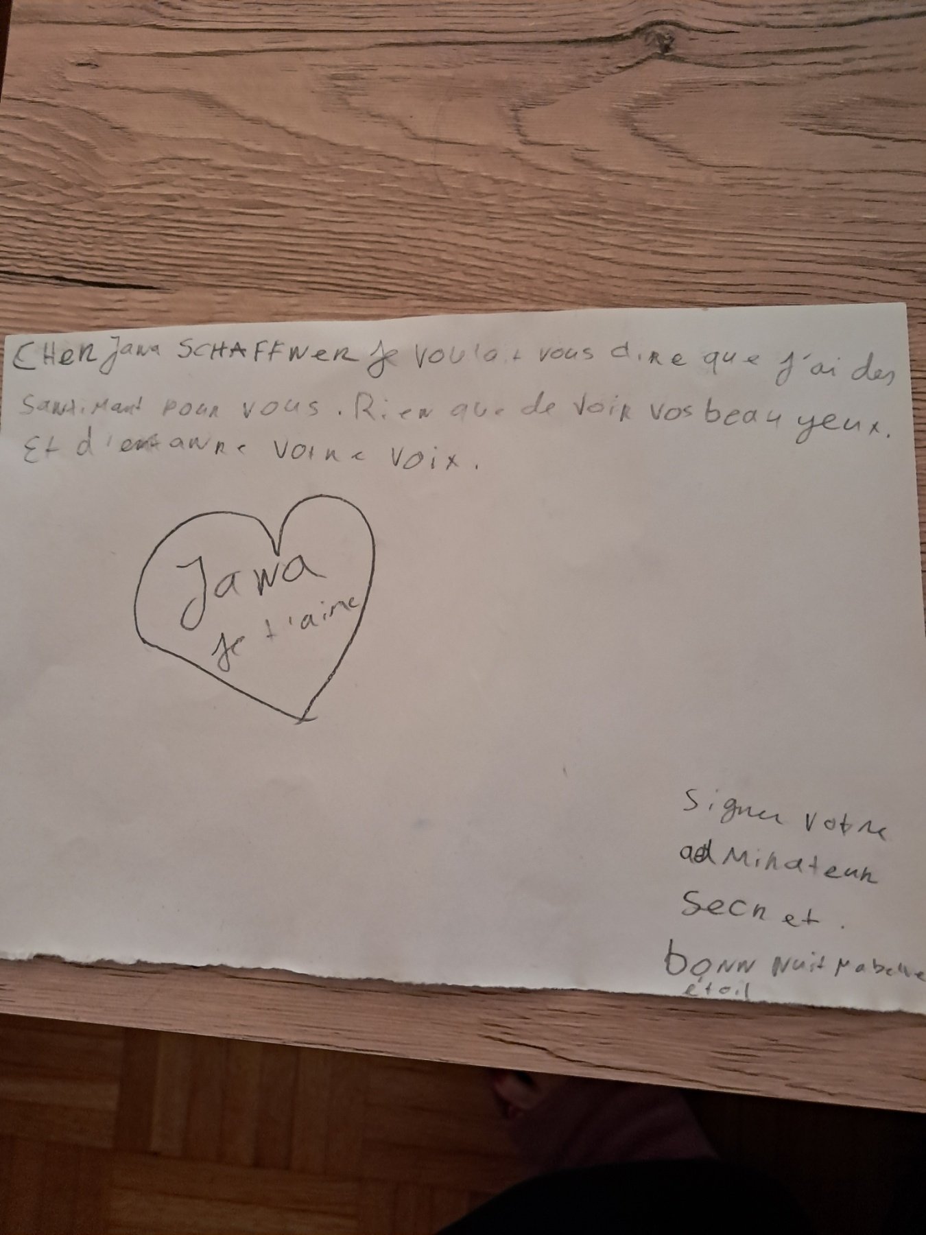 Пише: "Mила ..., бих искал да Ви кажа, че имам сантимент към Вас. Просто виждам красивите Ви очи. Чувам Вашия глас. Яна, обичам те. Подписано от Ваш таен обожател. Лека нощ, моя красива звезда."