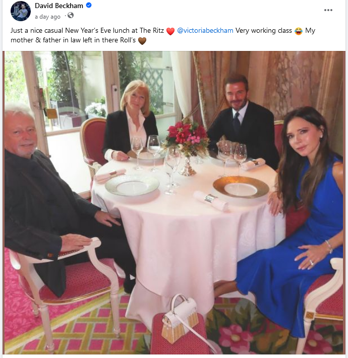 'Just a nice casual New Year’s Eve lunch at The Ritz. @victoriabeckham Very working class. My mother & father in law left in their Rolls.' („Просто хубав стандартен новогодишен обяд в The Ritz. @victoriabeckham Много работническа класа. Тъщата и свекър ми си тръгнаха с техния Ролс-Ройс")