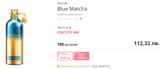 Montale Blue Matcha, EDP, 100ml за тестер - 112,32 лв, за продукт - 134,55 лв (ако се взима от офиса им, се оскъпява с около левче)