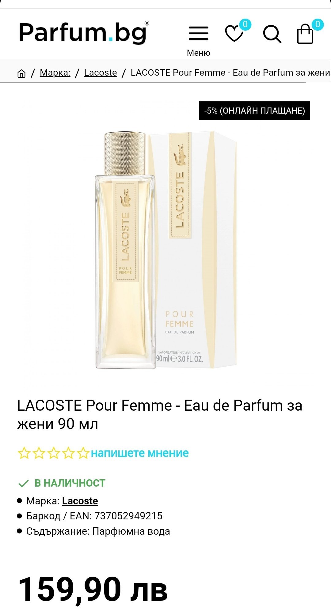 Някой виждал ли е наскоро Lacoste Pour Femme на добра цена? 90 милилитра? 30 мл има тук таме, но не ме устройва цената, а е един от любимите ми парфюми и искам да имам в запас. Изчезна и май е спрян или ще го спират.