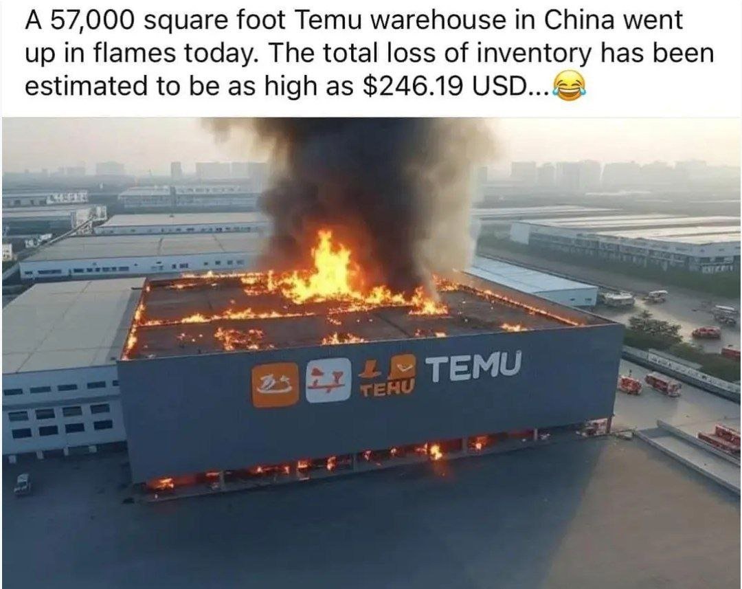 5300 квадратни метра склад на Temu в Китай изгоря в пожар днес. Щетите се оценяват на приблизително на $246.10 американски долара