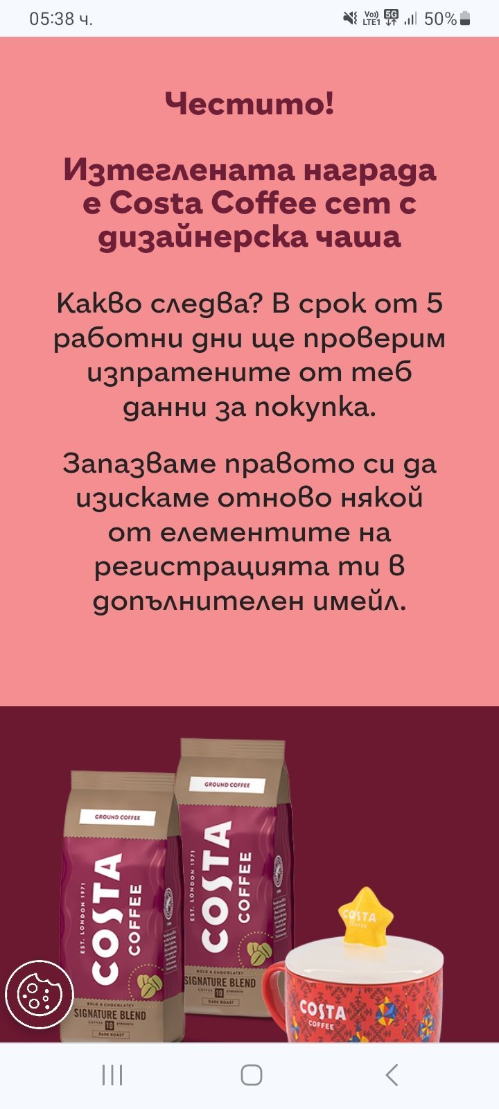 Привет, заповядайте от събота, 20.01. да си получите наградата (кафе-машина)в обекта. При получаването й в супермаркета, трябва да търсите управител или негов заместник и да носите документ за самоличност и касовата бележка, с която сте спечелили.  Нейното предоставяне е задължително и то в оригинал.