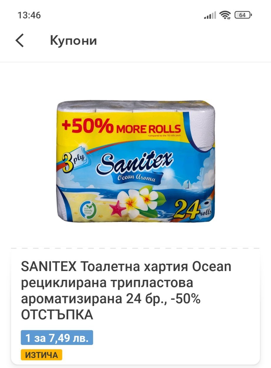 Снимала съм ролка Санитекс от малка опаковка с 4 броя. Коректно е да кажа, че ролката Санитекс не е нова. Но от големите опаковки може да се очаква ролките да са една идея по-рехави от малките опаковки (при някои марки има компромис с качеството).