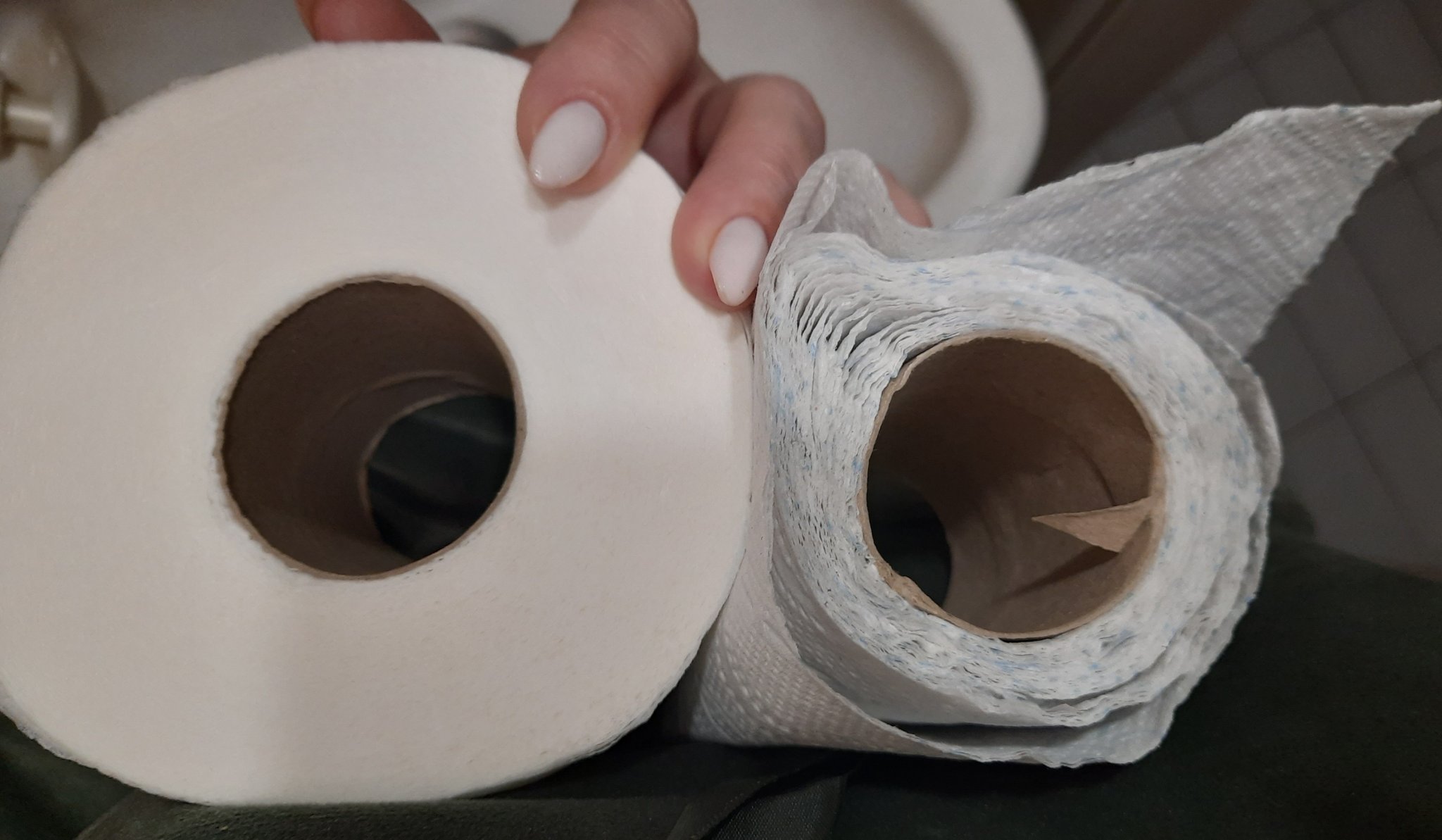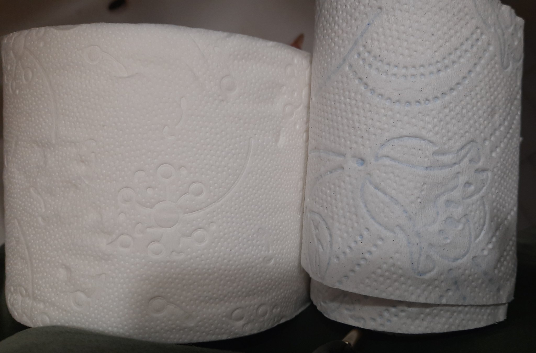 Отдясно е Санитекс Оcean, отляво е К-класик (нова ролка), която купуваме (200 къса на ролка, бяла и без аромат):