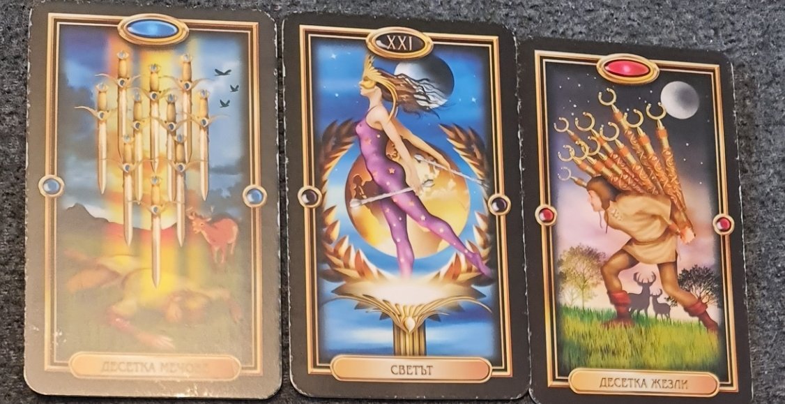Първата ми мисъл с тази 10м+Света беше за смърт и честно казано малко се притесних какво ме очаква през деня с тези карти... но ето, че картите могат да показват и събития, които не са свързани лично с мен, но понеже приех тежко случилото се, стана ми тъжно и вероятно затова тази енергия се е отразила в картите, визирам кончината на Патриарх Неофит.