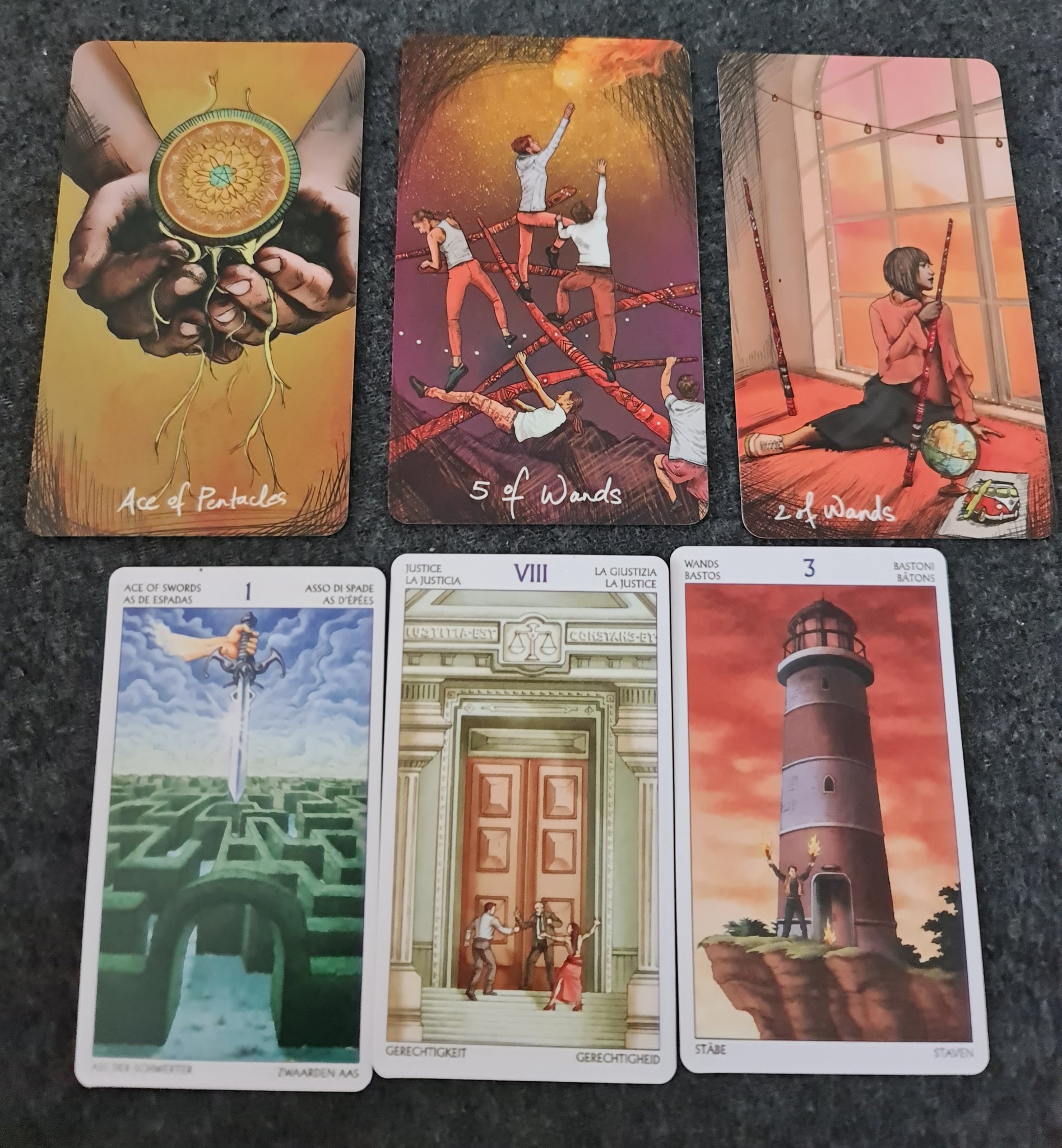 По принцип ме чакат да си взема книжката сега на втория опит след като веднъж ме скъсаха. Което води към втория ред. Десятка пентакли ме обнадеждава в цялата работа, но дявола с отшелника ме притесняват.