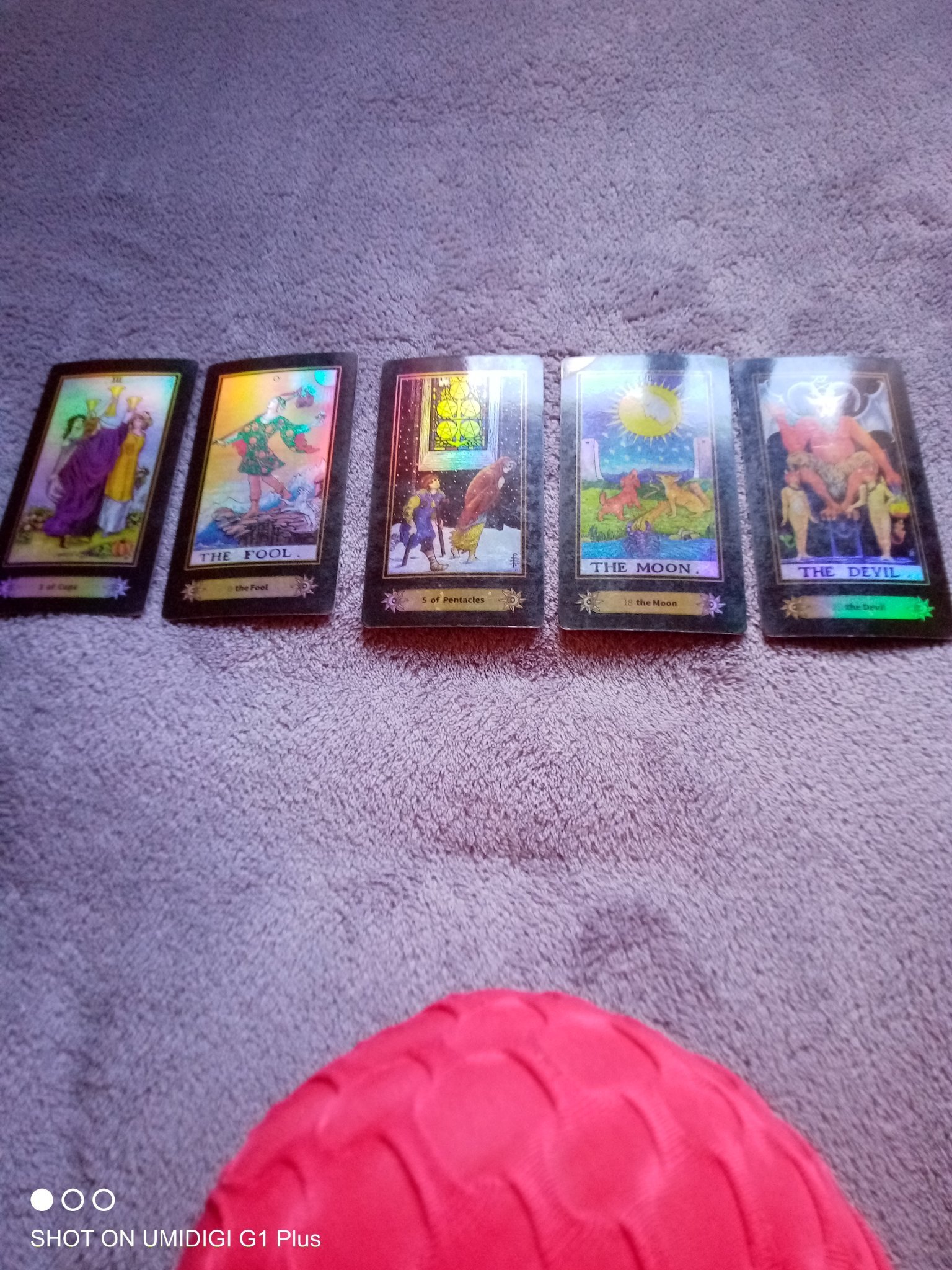 Деси Dath, по 3 чаши и Глупака си мисля, че тук е имало някакво взаимодействие, но то не е било особено дълбоко, а по-скоро за забавление. По 5 пентакли това или е приключило, или на някой нещо в тези отношения не му достига, чувство се ощетен. Но този човек отказва да види реалността по Луната и по Дявола се вманиачава в ситуацията и не може да я напусне. За мен не са хубави тези карти и нищо няма да се случи между двамата. Най-много секс да правят.