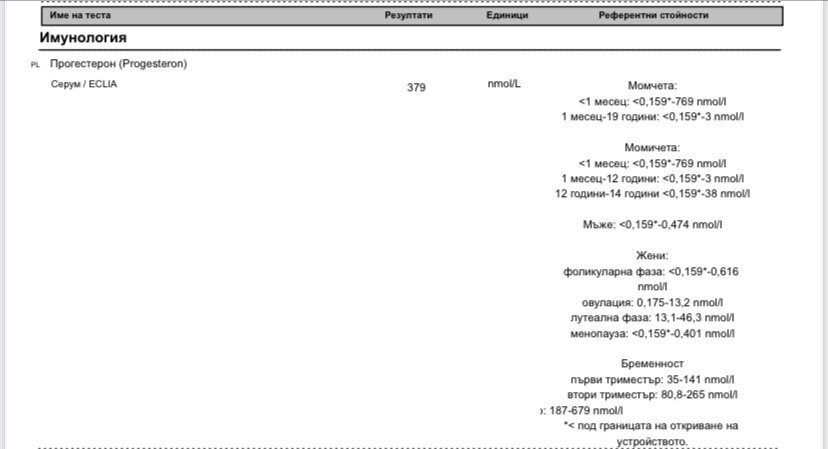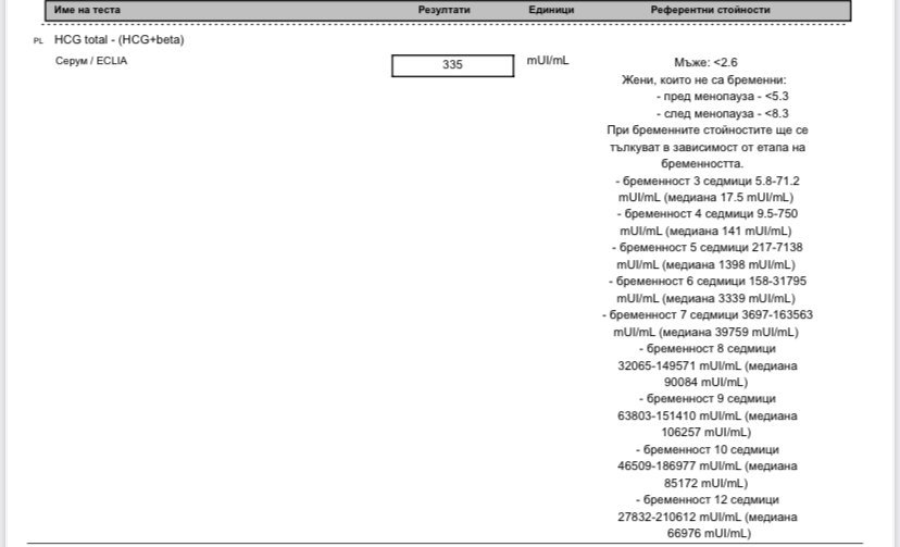 Привет, момичета! Идвам да споделя моя първи резултат от кръвния тест след ЗЕТ. Трябва да призная, че бях малко на тръни по време на подготовката, защото въпреки естрофема лигавицата от 7.22 ММ на2ри ден, на 9ти ден бе само 6.5 ММ. Увеличиха ми естрофема, аз увеличих разходките, пих чай от малинови листа и стигнах на 13ти ден МЛ -7.6 ММ/8.55 ММ ( Пиша и двете стойности, защото са от две последователни измервания). Мислех, че ще отменят ЗЕТ, заради лигавицата, но не.. Не зная колко е била в деня на трансфера, докторът само каза, че е подходяща. И се доверих. Ето и резултата: