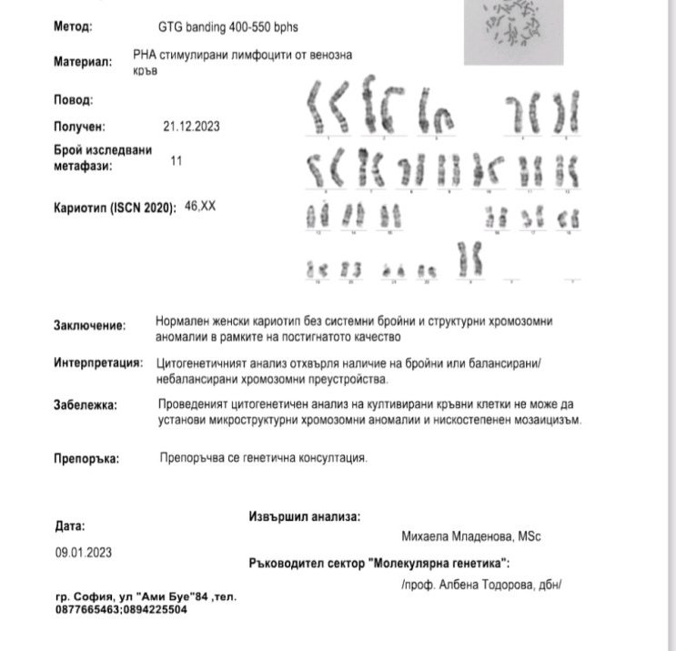 Те предоставят снимки. Предвид че вече сме правили катиотипи, не ни е препоръчвала да правим втори път. Даже каза че няма смисъл да даваме пари втори път за едно и също изследване. Обаче тези, които не са пускали още, ако преценят, могат да си проверят в кои лаборатории дават снимки.