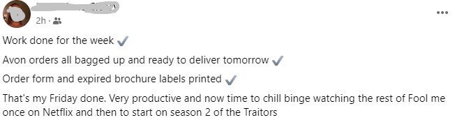Та, аз работя за английския пазар с въпросната колежка. Работата е за 0,5 FTE, но са я раздули за двама човека, тъй като въпросната англичанка постоянно бучи колко много работа има. Което е пълна лъжа. Ана е от малко провинциално английско селце, най- интересното, в което е кога минава камиона за мляко. Дълги години е страдала от депресивни състояния, родила е на 18, бащата я е изоставил и няма човек до себе си. Постоянно поства във фейсбук от онези статуси, модерни преди 20тина години: " Измих банята, отивам на пазар в Теско, а довечера ме чака вечеря в нашите"; Има втора "работа"- била дистрибутор на Ейвън и това било признак колко трудолюбива била.