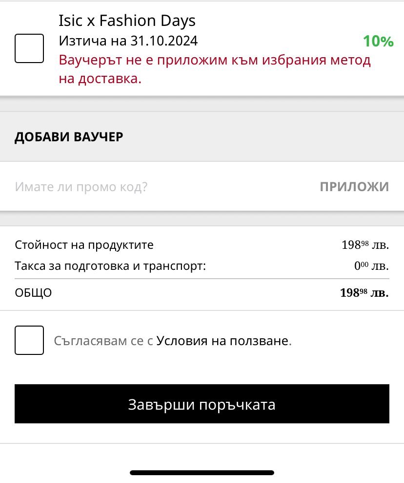 Момичета, имам някакъв проблем с кода за 10% отстъпка във fashiondays, дава ми, че не е приложим с метода на доставка. Пробвах с всички методи и все същата грешка. При вас така ли е?