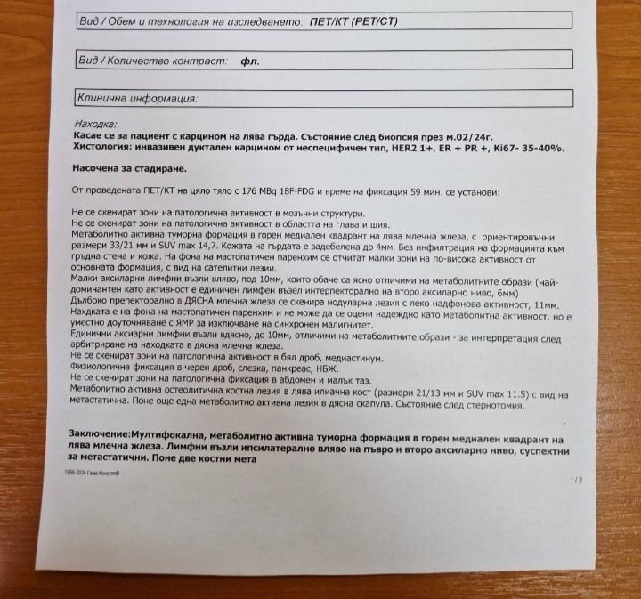 Пак съм аз момичета.Изслезе Пет скенера и положението е лошо.Има костни метастази и нещо в другата гърда,което не знаят метастаза ли е или нов рак.Трябва да се направи ЯМР,но не може заради клипове от сърдечна операция.Свързахме се с лекаря който я е оперирал,но понеже е била1989г и той не е сигурен какво е било.Обеща утре да разбере и да се обади.Минахме и при доц.Димитрова,доц.Цонев бил в болнични.Предлага таргетна терапия на хапчета и хормонотерапия.Може да почне след 2-3 седмици.Те не можели да дадат направление за ЯМР и не знаят кой може,само за ПЕТ,а ние вече имаме.Кой може да издаде такова направление.Защо не и правят химиотерапия,това ме притеснява.Имали някой само на такава терапия със мети.Иначе тумора не е толкова голям,колкото на мамографията.Ще направим и други консулти,но искам да чуя и вашето мнение.