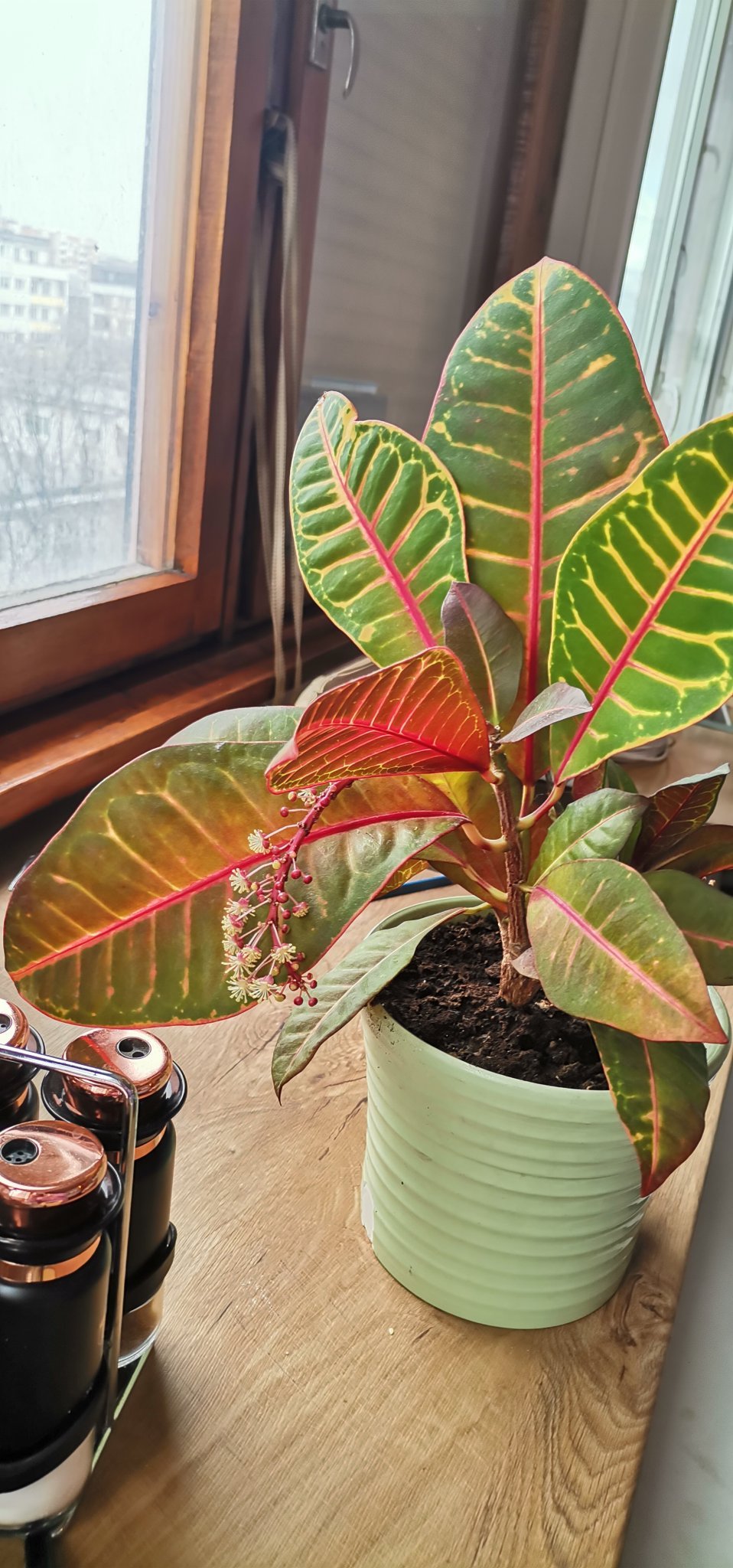 Ето и един кротон, които спасих преди 2 години. Една приятелка го беше забравила в колата на 15ти септември. Беше почти без листа. Още тогава му отрязах връхчето ( беше голо дълго стъбло) и ето го две години по-късно 😍