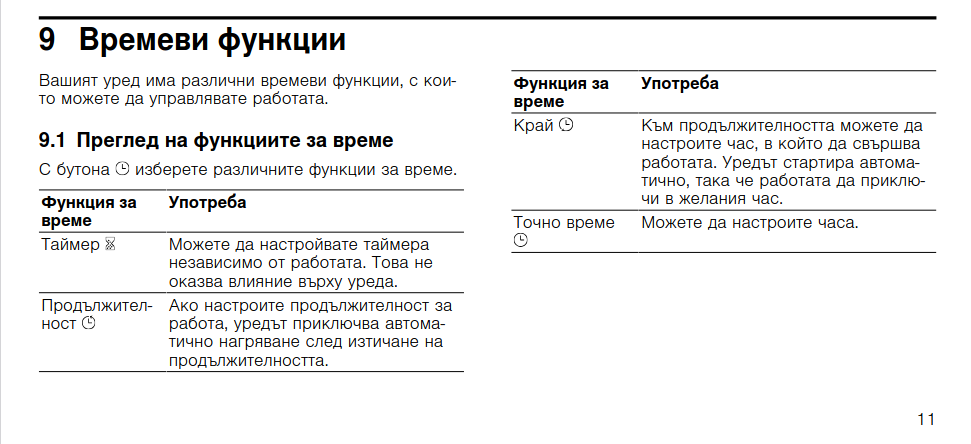 Да, пропуснали сте - вижте раздел „Времеви функции“, стр. 11-13. Функциите са общо три: а) само да звъни, б) да пече определено време и да се изключи и в) да се изключи в определен час. Последното работи само заедно с „б“ и е нещо като отложен старт - фурната сама се включва зададеното време преди крайния час и се изключва във въпросния час.