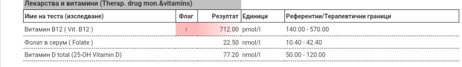 Излязоха ми и резултати за вит Д и вит Б12. Качила съм Д-то от 37,8 на 42,86 (пия по 3-4 капки на ден); Б12 от 470 на 578,5. Това за почти 3 седмици. Желязото пак си е окей, но е спаднало малко - от 18,9 на 17,9.