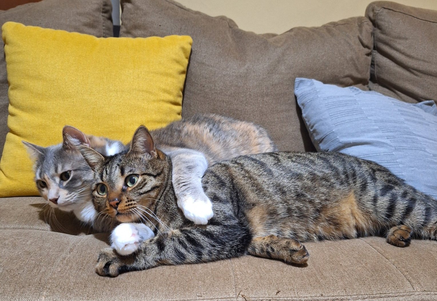 Това гушкане от снимката е 5 процента от ежедневието, останалите 95 са независимо и самодостатъчно съществуване всеки в стаята си, и гоненица и битка сутрин и вечер. Моите котове са във взаимоотношения майка-дете, и това може би има значение, когато съжителстват две или повече котки - дали ще са равни, дали ще има алфа доминираща.. и дали единия ще има нужда от другия. В нашия случай малкия търси майка си веднага, щом се събуди от сън, и отива и ляга при нея, за да го почисти.