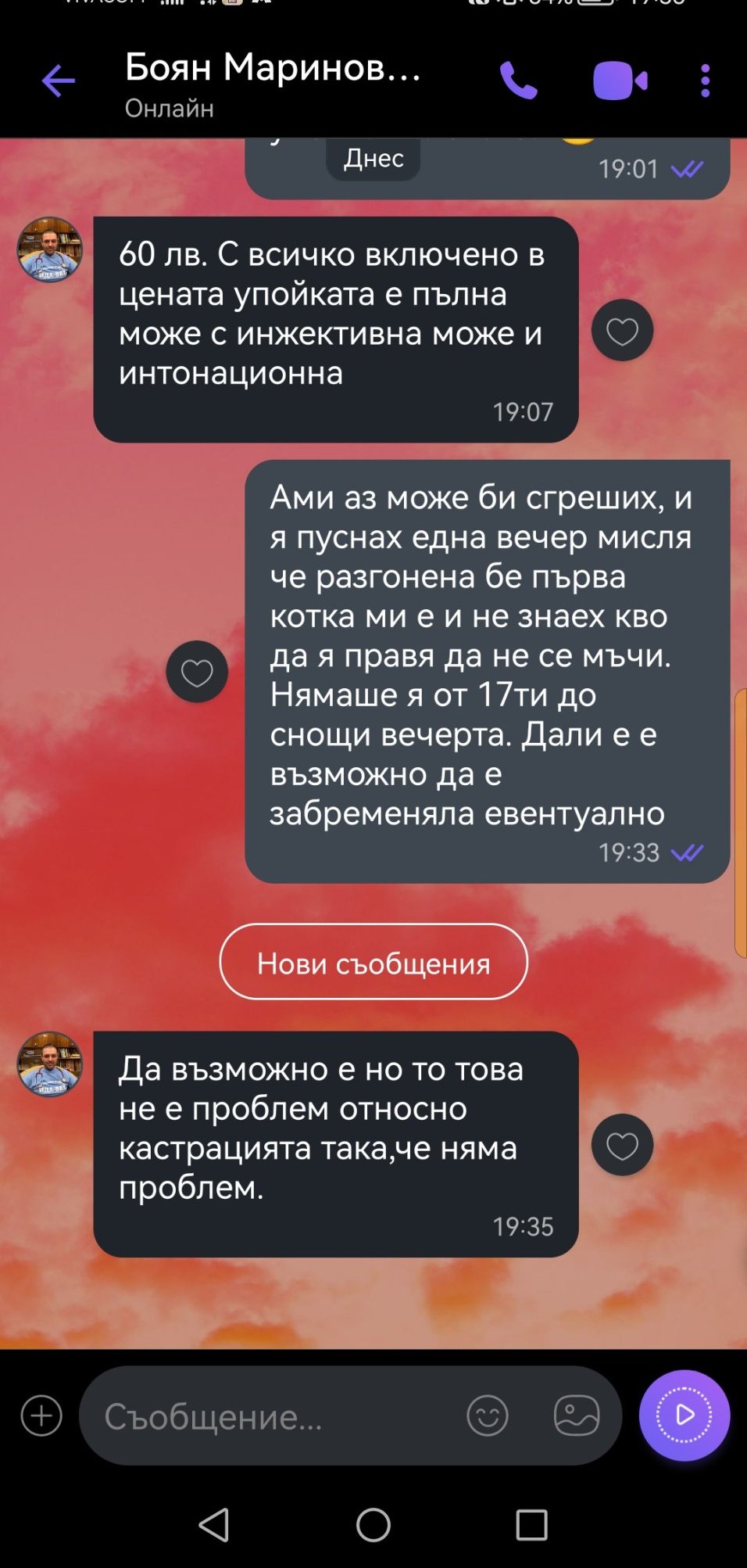 Вo, ако ми пратиш на лично името на клиниката, банковата им сметка, име на котката и точна сума, ще поема кастрацията. Но се разбери предварително с тях, че ще се плати с банков превод и ми кажи кога да го пусна.