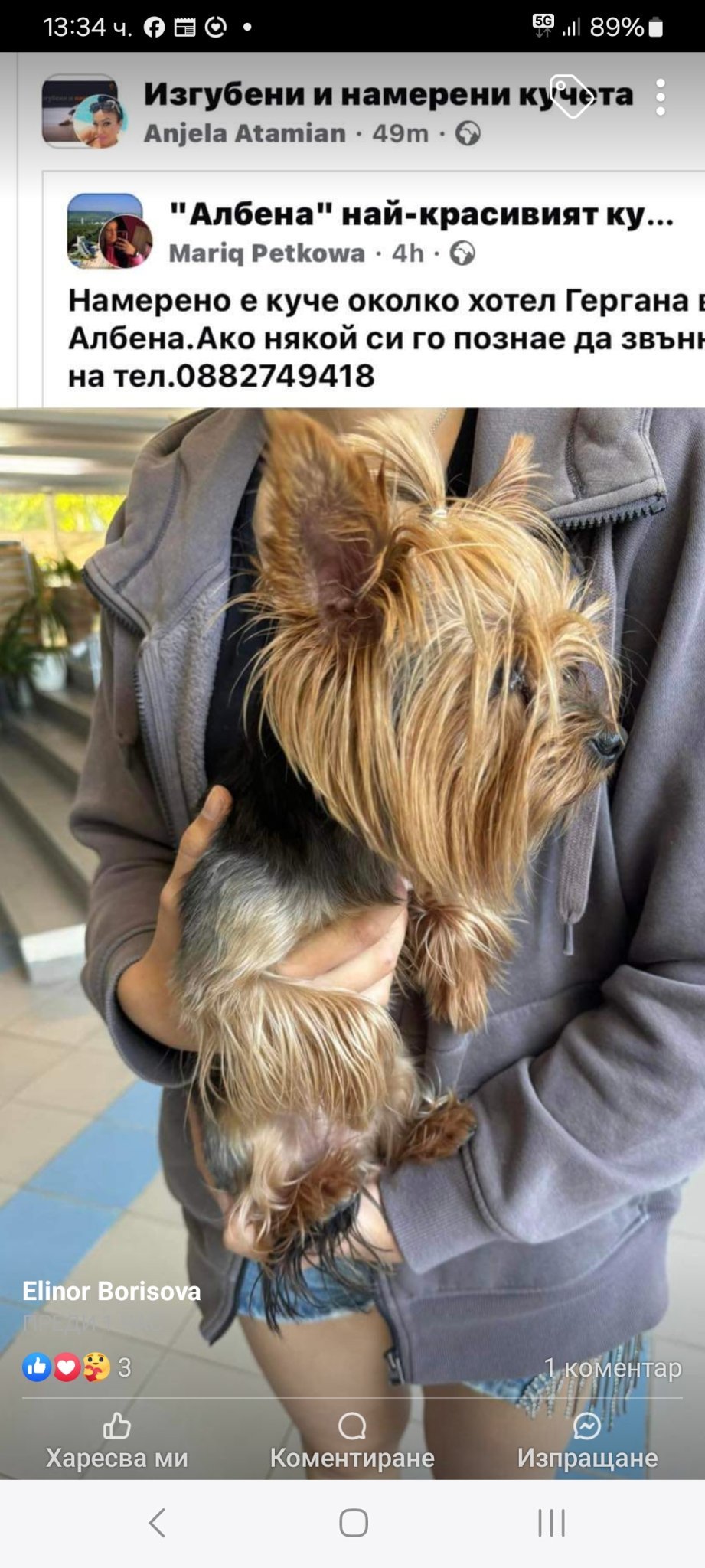 Кучето е намерено около хотел Гергана. Има телефон на човекът прибрал кучето. Вероятно е на гост с йорки. Може да запишеш телефона и го оставиш на рецепция. Може и от друг хотел да е и да е стигнало до Гергана.
