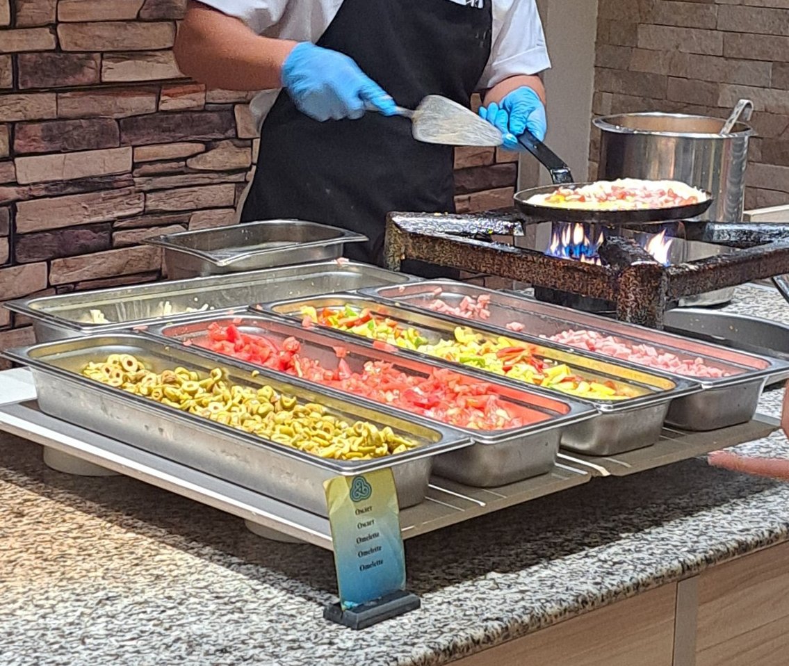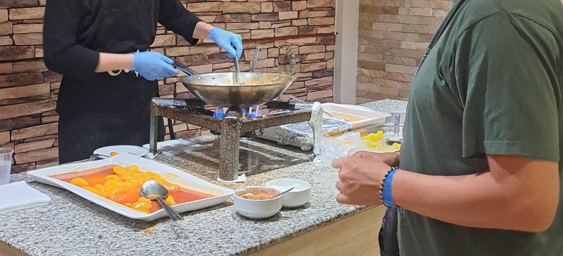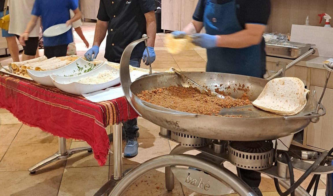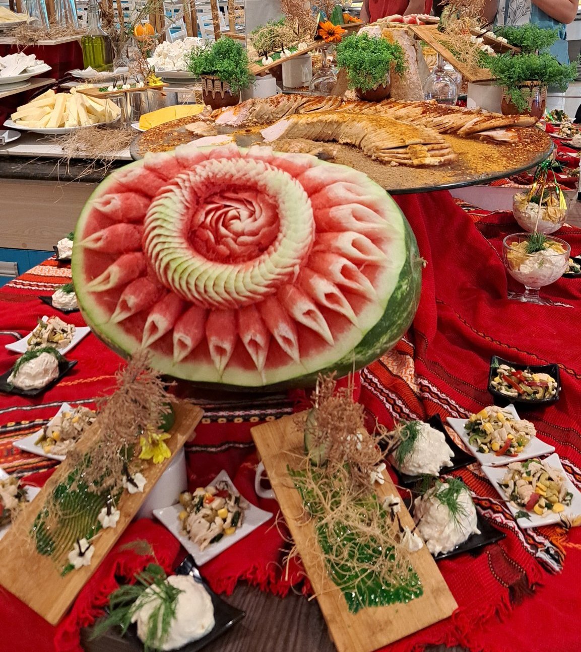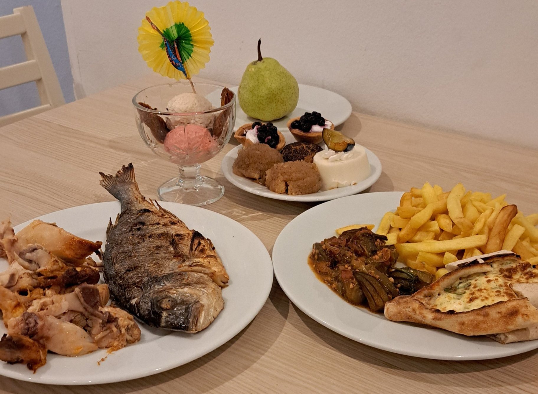 Ципура на скара, печено цяло пиле, пиде, сушени домати (като украса/на салата с дърпан кашкавал и копър), десерти - грис халва, панакота, тарталети, сиропирани курабии, пуширани круши/праскови (приготвени на момента)
