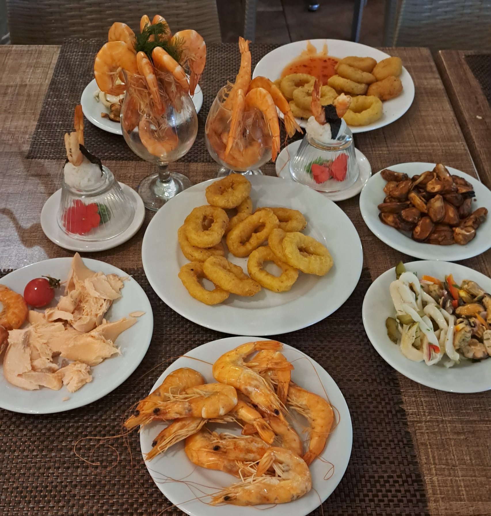 Пропуснала съм някои постове. Омари определено не съм виждала в Албена. Нито пък сувлаки. Но редовно похапвам три вида свинско (не в манджа). Но миди, скариди и калмари съм. Октопод само в салата. Котлет сьомга, ципура, лаврак също съм виждала, но не си падам по рибата.