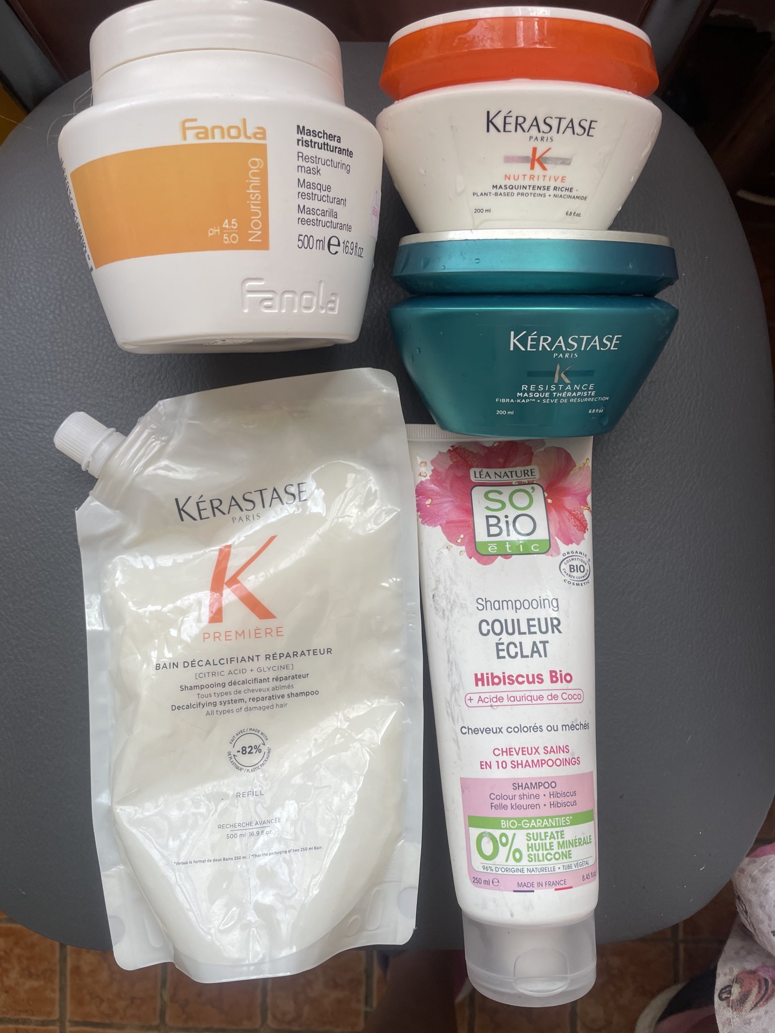 Това е с което разполагам в момента, като в дясно е шампоана,  балсама,  маските, а в ляво серум, олио, серум срещу късане, термозащитен серум след измиване на косата.