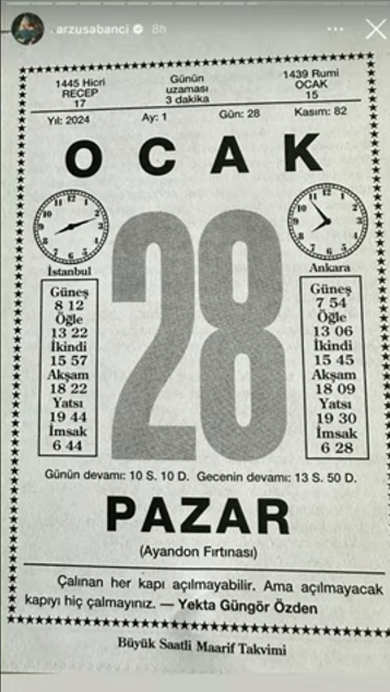 Думите на Йекта Гюнгьор Йозден на страниците на своя календар от 28 януари 2024г., споделени в последствие от Арзу Сабанджъ, а именно: "Не всяка врата, на която се почука, може да се отвори. Но и никой не чука на врата, която няма да му се отвори". Емоджито на Монтен за фразата "Хората наистина не те разочароват. Ти просто мечтаеш за грешните хора", привлече много внимание в социалните медии. Въпреки, че публикацията на г-жа Арзу е доста объркваща, се твърди че думите са били насочени към Ханде Ерчел. С мистериозните си публикации в социалните медии Арзу отново дава много материал за коментари. Повечето медии го споделиха.