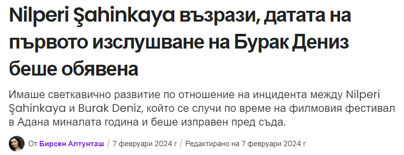 А случаят Нилпери Шахинкая & Бурак Дениз вече започва да се преекспонира. Каквото и да е било ми се струва, че Нилпери почва да прекалява. Нито е пострадала физически, нито успя да го докаже в съда. То пък чак затвор за Бурак искаше, все едно е убил човек. Много пресолява манджата.