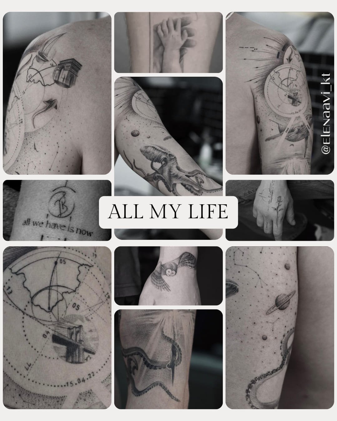 Други татуировки липсват (Пинокио от вътрешната страна на дясната ръка и още една на прасеца). Нямам ясна тяхна снимка.