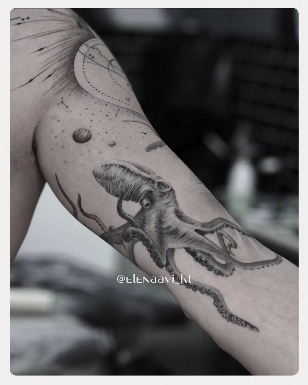 Освен това има морски създания (кит), показващи любовта и уважението му към животните, особено към подводния свят, и октопод, който Къванч срещна в деня на рождения си ден.