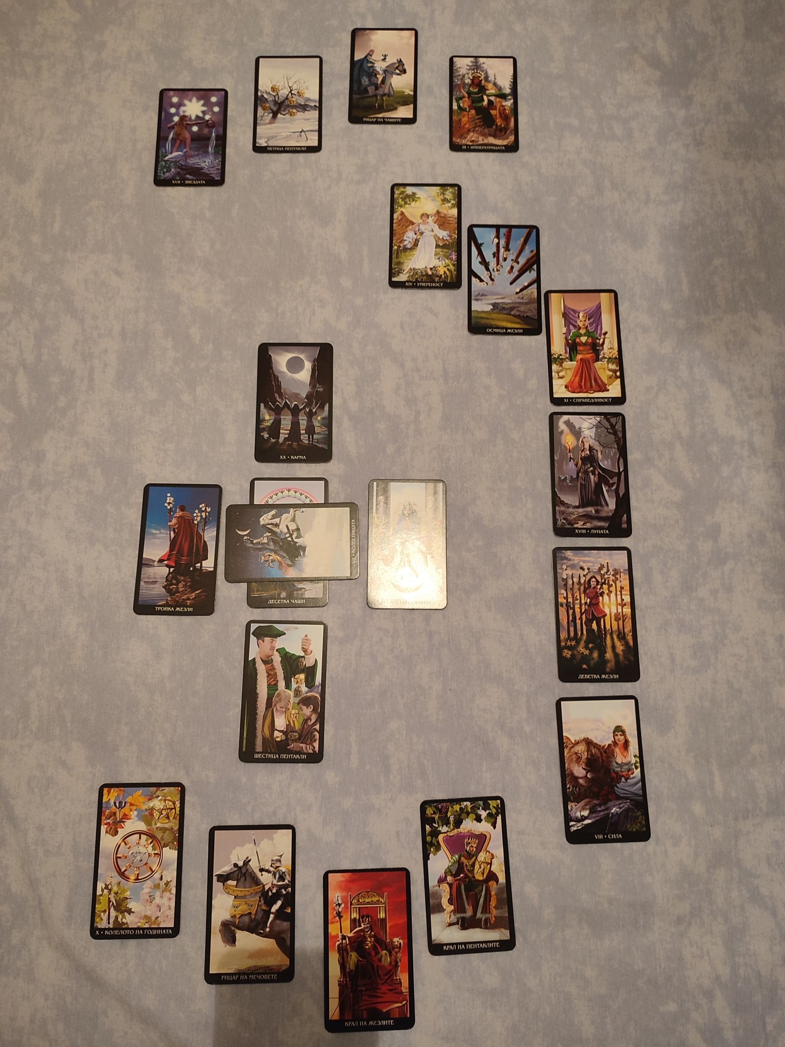 Понеже четенето стана много голямо и няма как да го кача, ако някой желае, мога да му го изпратя, за да се види нагледно как съм тълкувала картите.