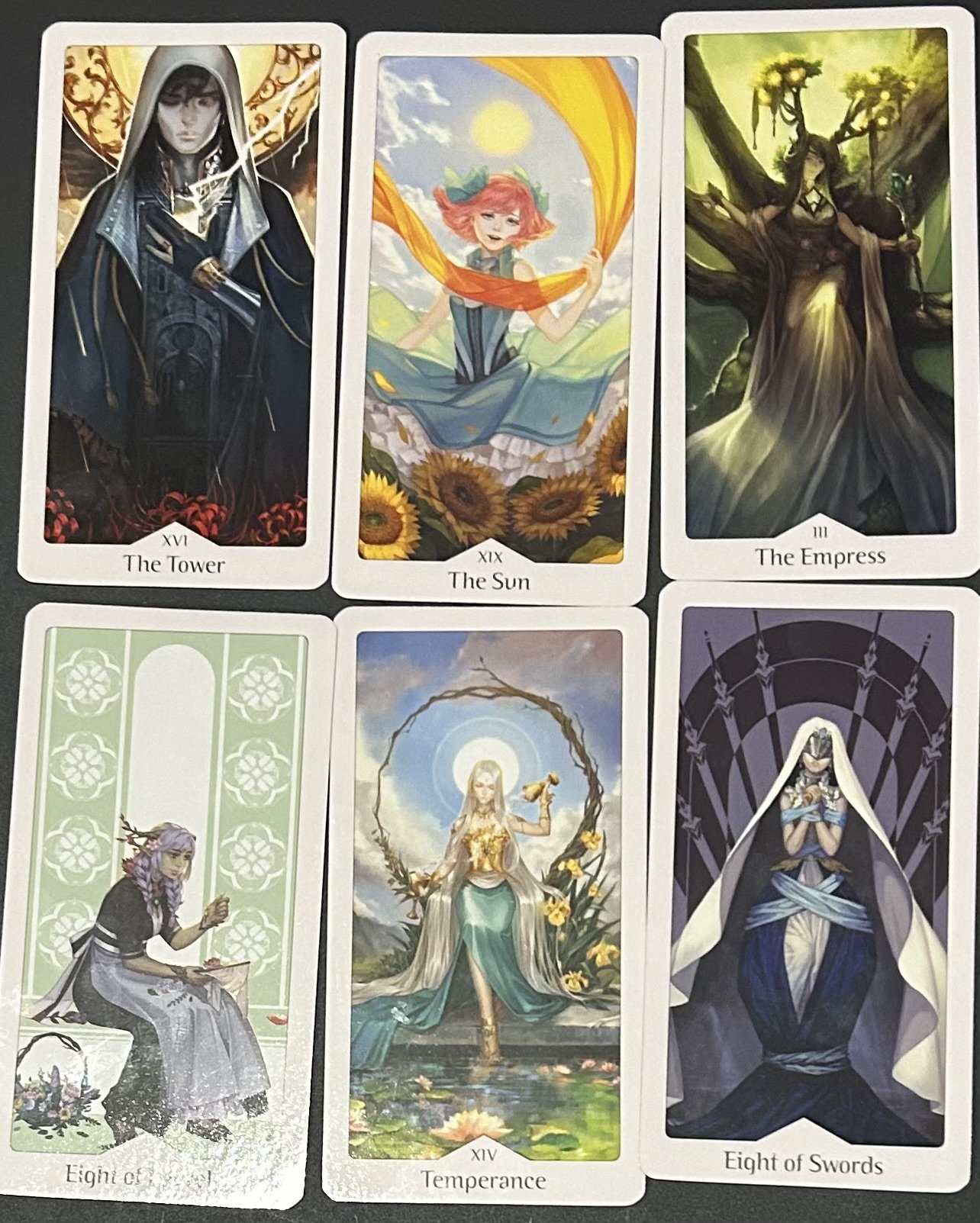 На втория ред се виждам погребана в работа, честно казано. Работа по 8 пентакли, зацикляне по Умереността, капан по 8 мечове. Отделно, числото осем е знака за безкрайност, а тук са две осмиците. И тази “любима” Умереност….