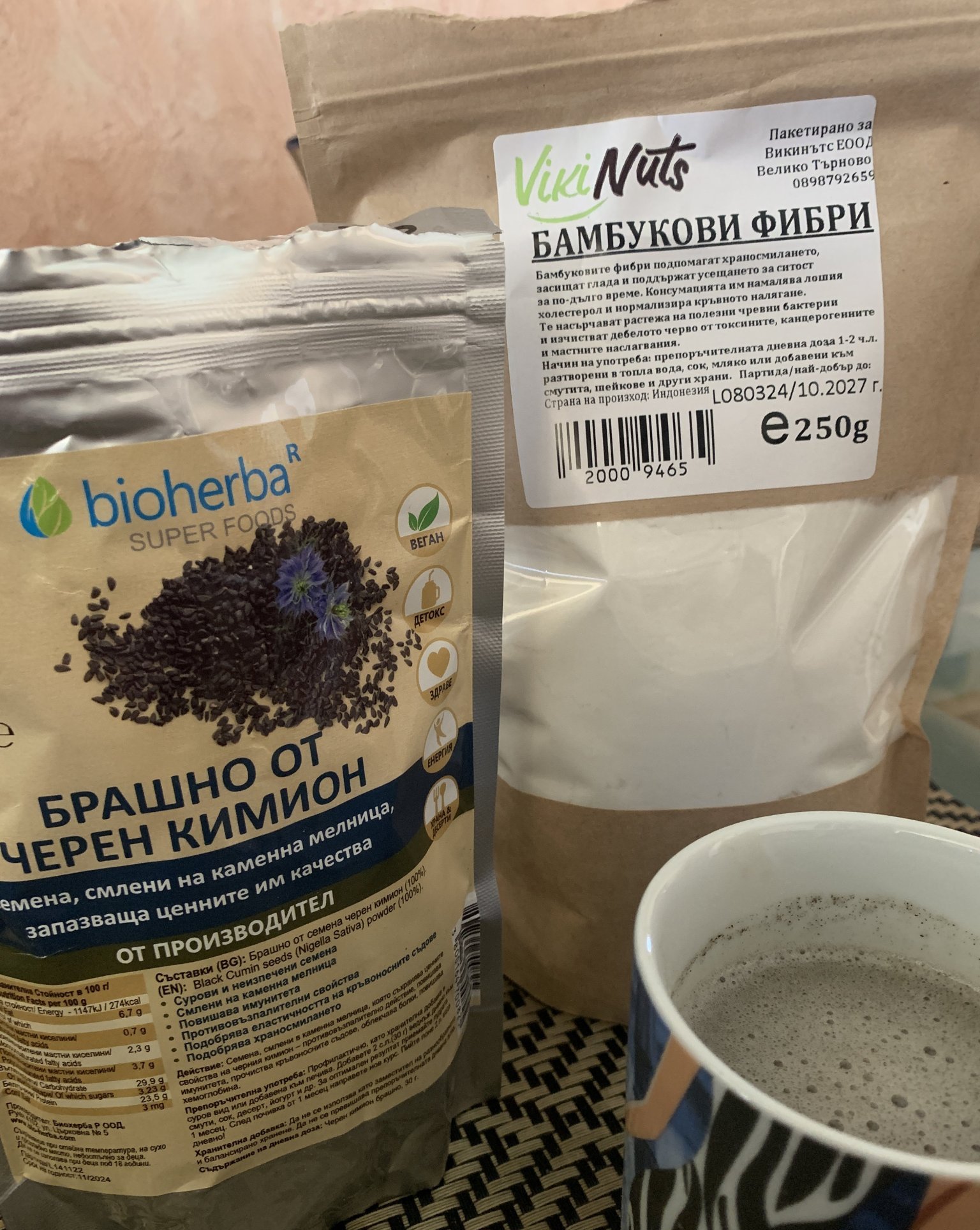 Вчера реших да добавя и по лъжичка бамбукови фибри/също не се усещат/…днес решавам да добавя още една “полезност”-протеин от чия…,но бях без очила и съм отворила пакета с брашно от кимион 🤢
