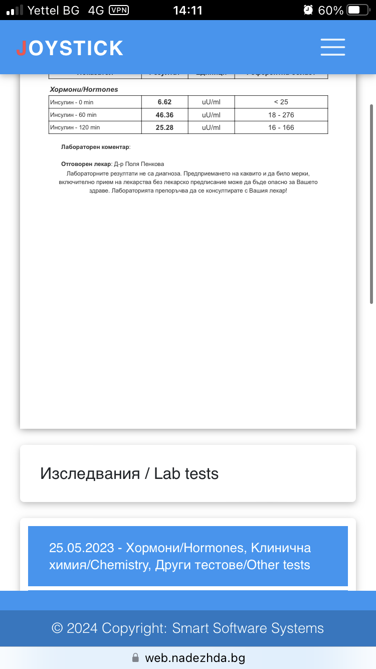 Само исках да уточня - може да се случи при ИР инсулинът на гладно е приемлив и на 120 обаче е висок. Ако и на гладно е висок отива на преддиабет или диабет. Та оттам и тънкостите да се гледа на 60 и 120мин как се движи, но много лекари го игнорират, назначават само на гладно и ако е ок - нема проблеми. Ама стане ли висок е късно за корекции, ама те нали си назначават лечение, какво ги брига че е можело да го предотвратят… Та и лекаря е важно да е читав.