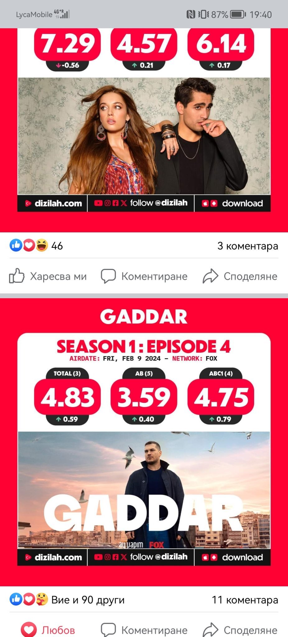 Където и да видя Чачо и Гаддар имат най-много харесвания ,пък все е с по-нисък рейтинг. Лъжат ли тези хора не знам . Дано не спрат сериала ,че четох такива коментари . Но не мисля . Започваме да вървим нагоре . Няма да е лесно конкуренцията е утвърдена ,но ще се утвърдим и ние . То ,друга продукция не знам ,дали би издържала ,иначе. Ама ,шефът ,шефът трябва да де активира. Не става така. Особено при комшиите . Човекът иска с талант и работа ,ама само това при комшиите ,явно не стига ... Обаче в чужбина си върви много добре . Чета масово коментари от чужденци ,които харесват Гаддар. Даже чуждия пазар за този сериал май е по-добрата и печеливша опция.