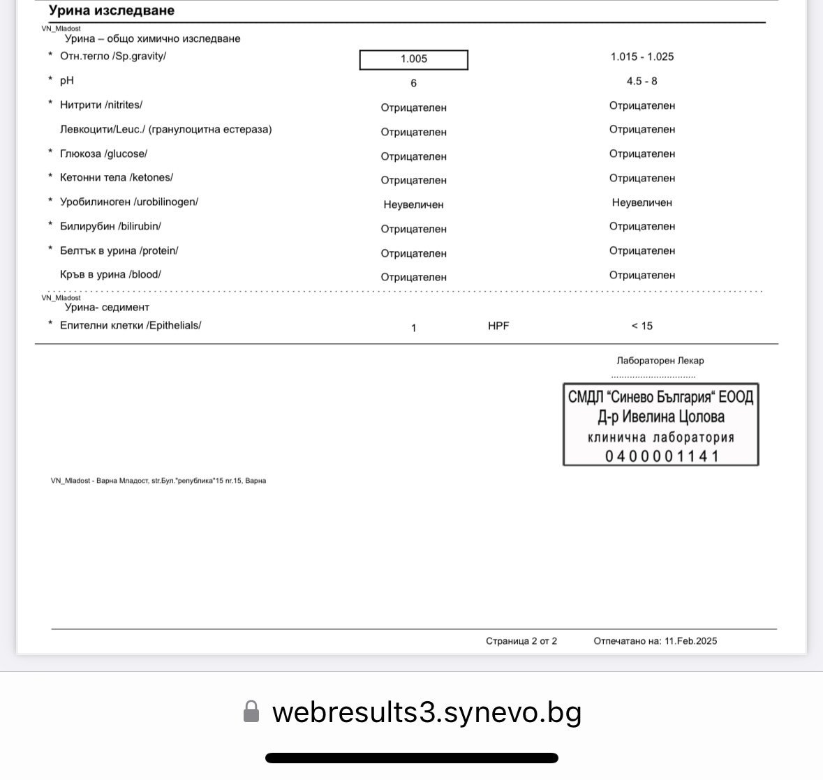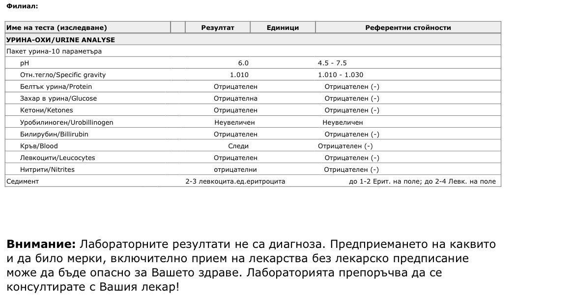 Jennifer,в неделя беше кризата без кръв,вечерта към 19 ч имах 37,7 температура.вечерта преди лягане пих монурал,сутринта имаше леко розово на хартията(в менопауза съм,така че изключвам менструално течение)вчера пуснах обикновена урина но не сутрешна(36 часа след монурала)и ПКК и Црп-което беше 38😔всичко друго в норми!Усещам напрежение в пикочният мехур,и тази сутрин сякаш ме наболяват бъбреците,но пия страшно много вода и много ходя да пишкам!От 2 часа не съм спала,дразни ме пикочният мехур,и пак ходих до WC но по по-малко!Сега след измиване се изпишках пак за обикновена урина,и пратих мъжа ми да я занесе,но до колко ще покаже нещо,предвид че цяла нощ си пишках…,вече съм в ужас!Температура нямам,до сега толкова дълго не съм била така кофти!Прикачвам урината от вчера,ще чакам днешната да видим!Бистра е иначе