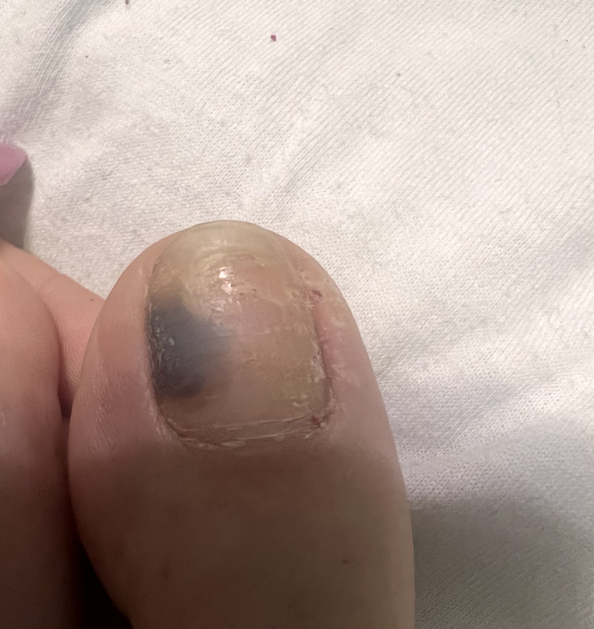 Имала съм няколко пъти подобни синини под нокът на крака. На снимката ви изглежда травмиран и напукан, люспи се. Докато отидете на лекар, може да изрежете нокътя колкото може надълбоко и да покиснете крака в топла вода с морска сол. При мен даже оцветяването изчезва, когато водата успее да влезе под нокътя и разнесе засъхналата кръв.