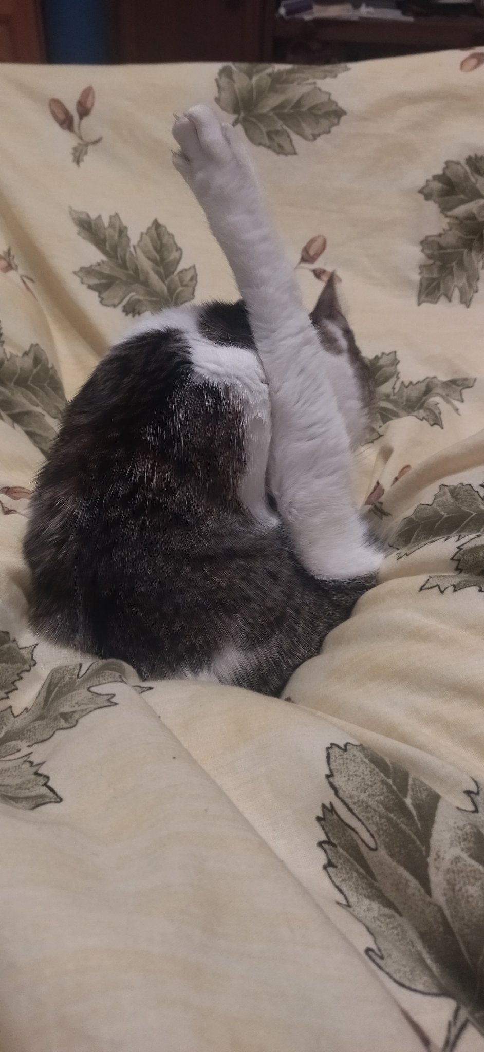 Като видях сладура Блеко, да покажа и нашето кравайче. Голяма акробатка е като се ближе, но си е чистница. Много време отделя за това.