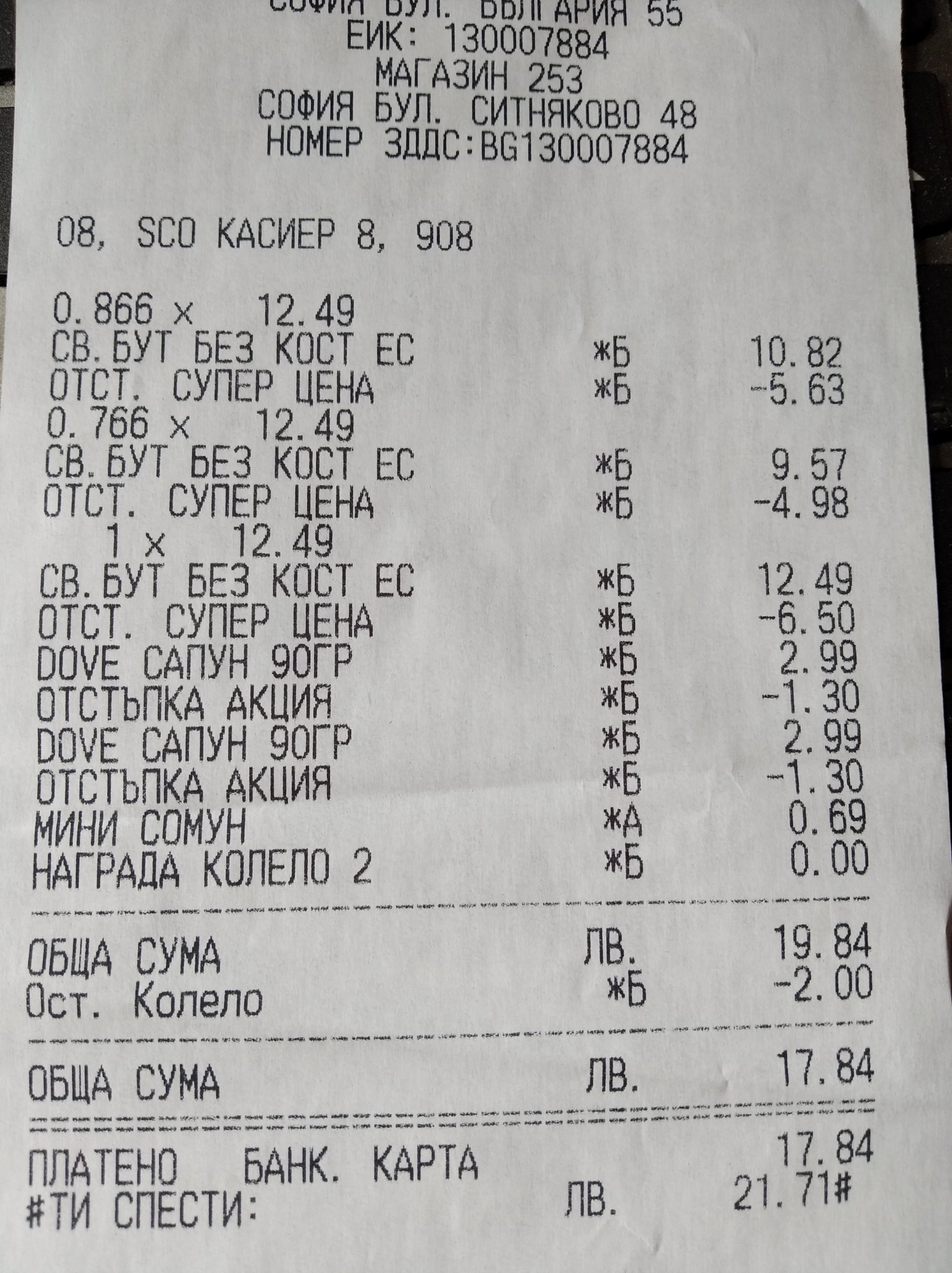 Не знам дали има значение реда, но аз сканирах първо картата, после продуктите, после кода на наградата. На момента показва само, че е сканиран код от колелото. Корекцията се появява чак при финализиране на сметката.