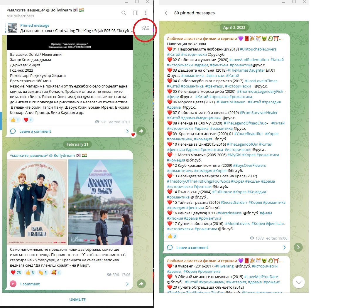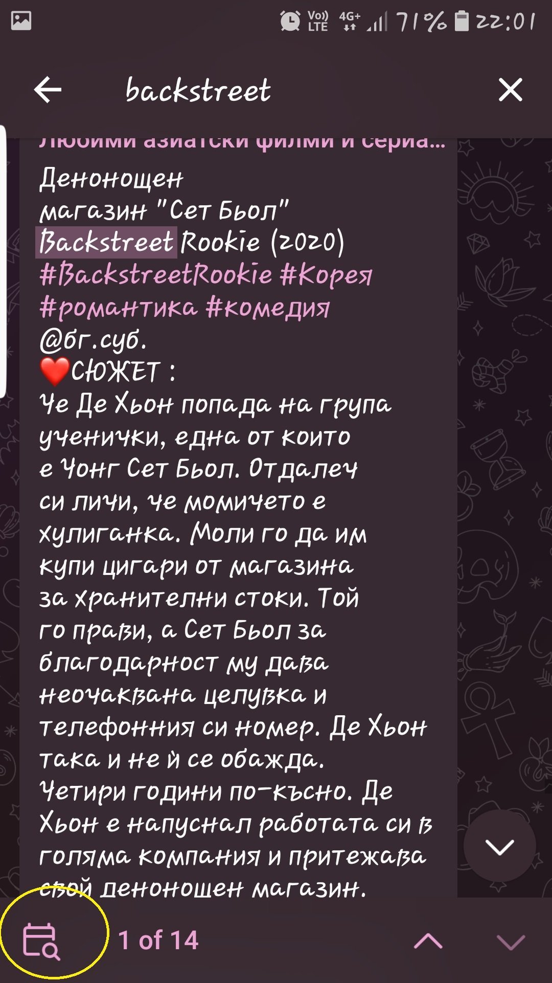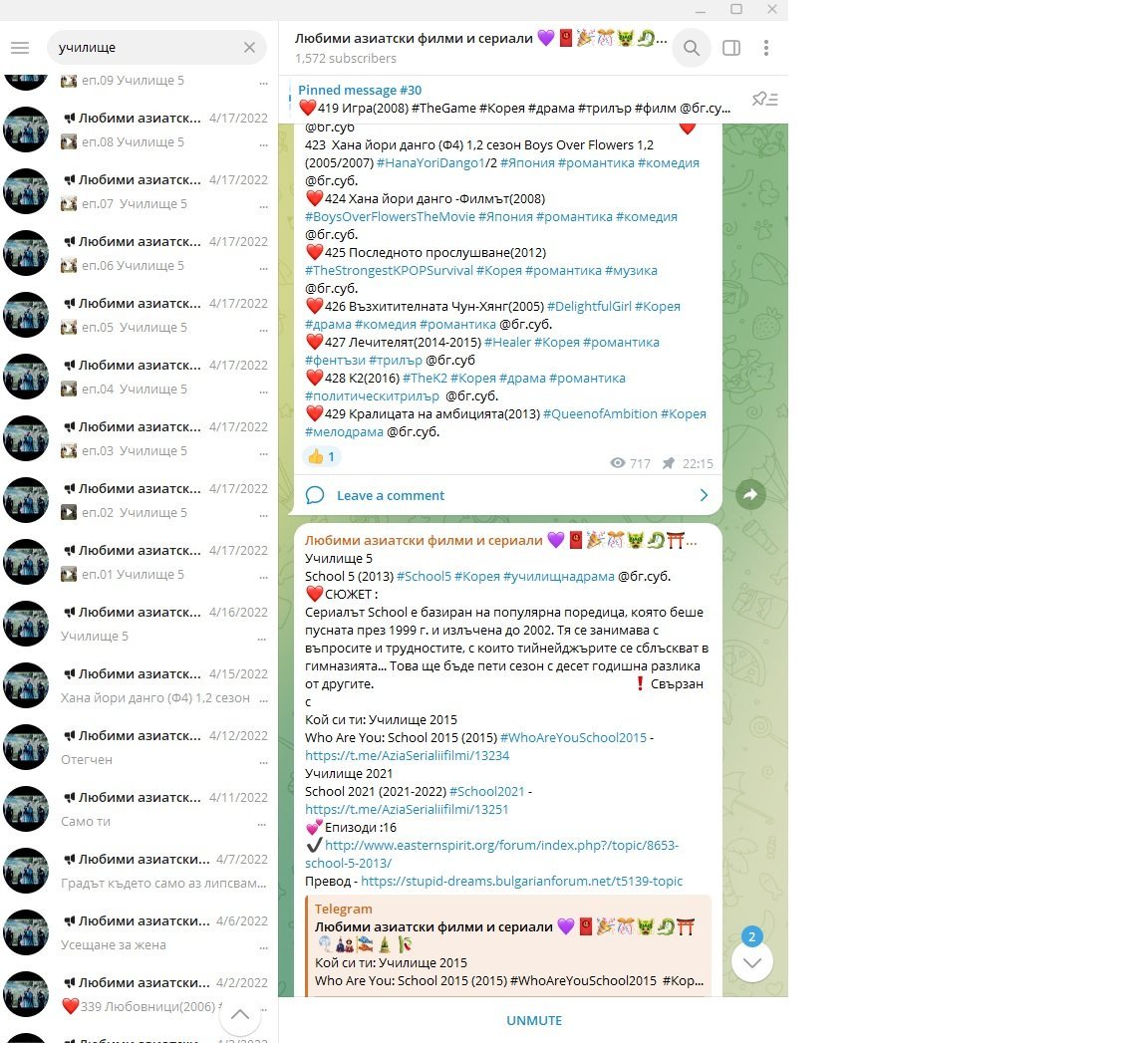 Бел, Криси, благодаря за разясненията. Отнасят се за настолната версия на Телеграм, нали? Понеже при мен на мобилната е малко по-различно, но като цяло доста лесно се намират нещата. От трите групи единствено с "Любими азиатски филми и сериали" ударих на камък, а точно там е онова, което ми трябва (Училището). След няколко неуспешни опита за лично успокоение ще си кажа, че и утре е ден 😂и ще се насоча към Плейтюб да понаваксам със сериала на Минка.