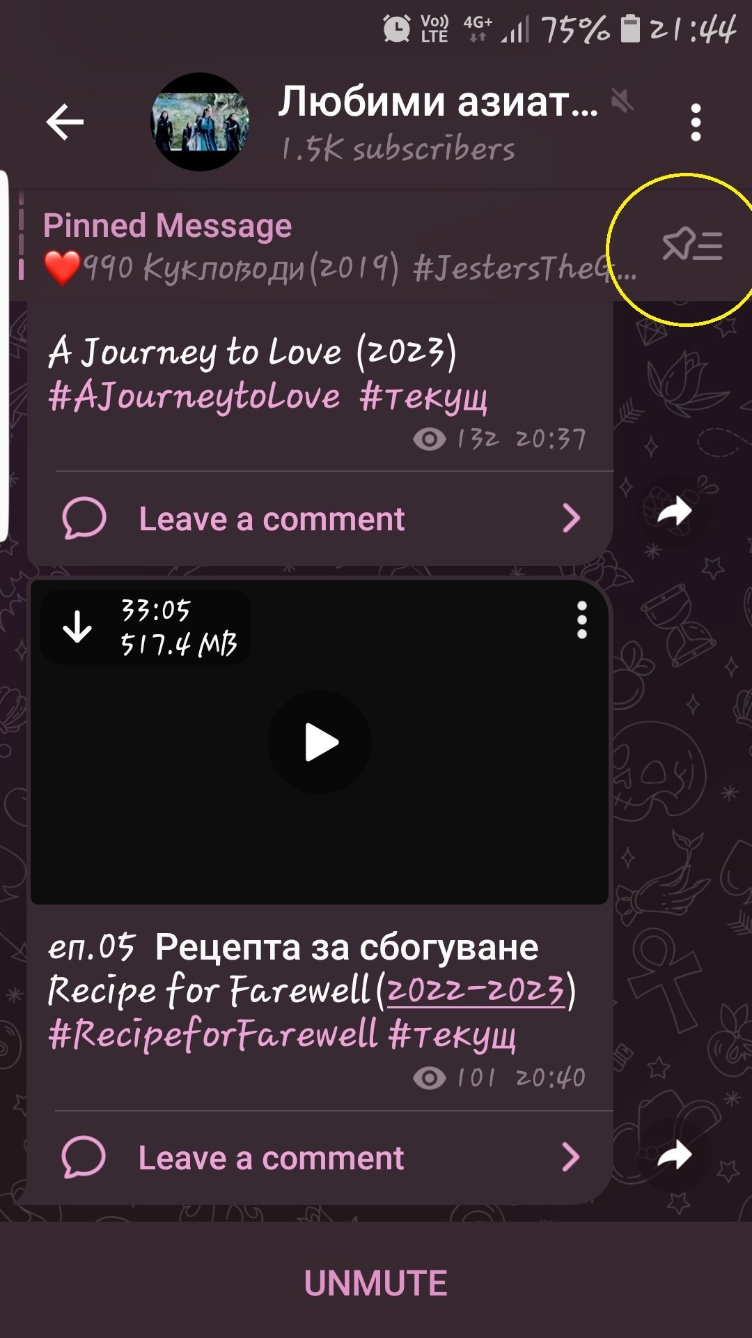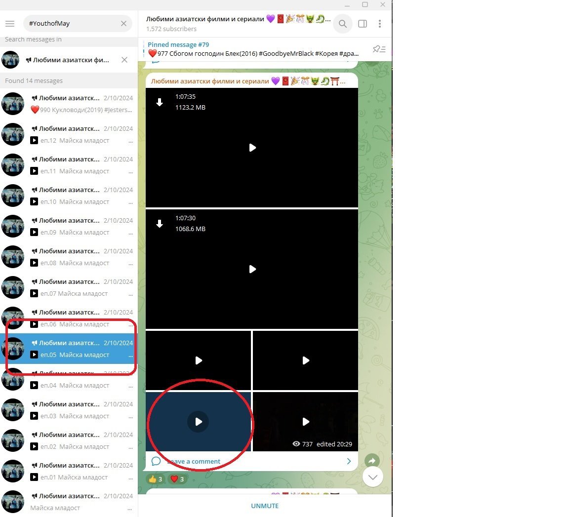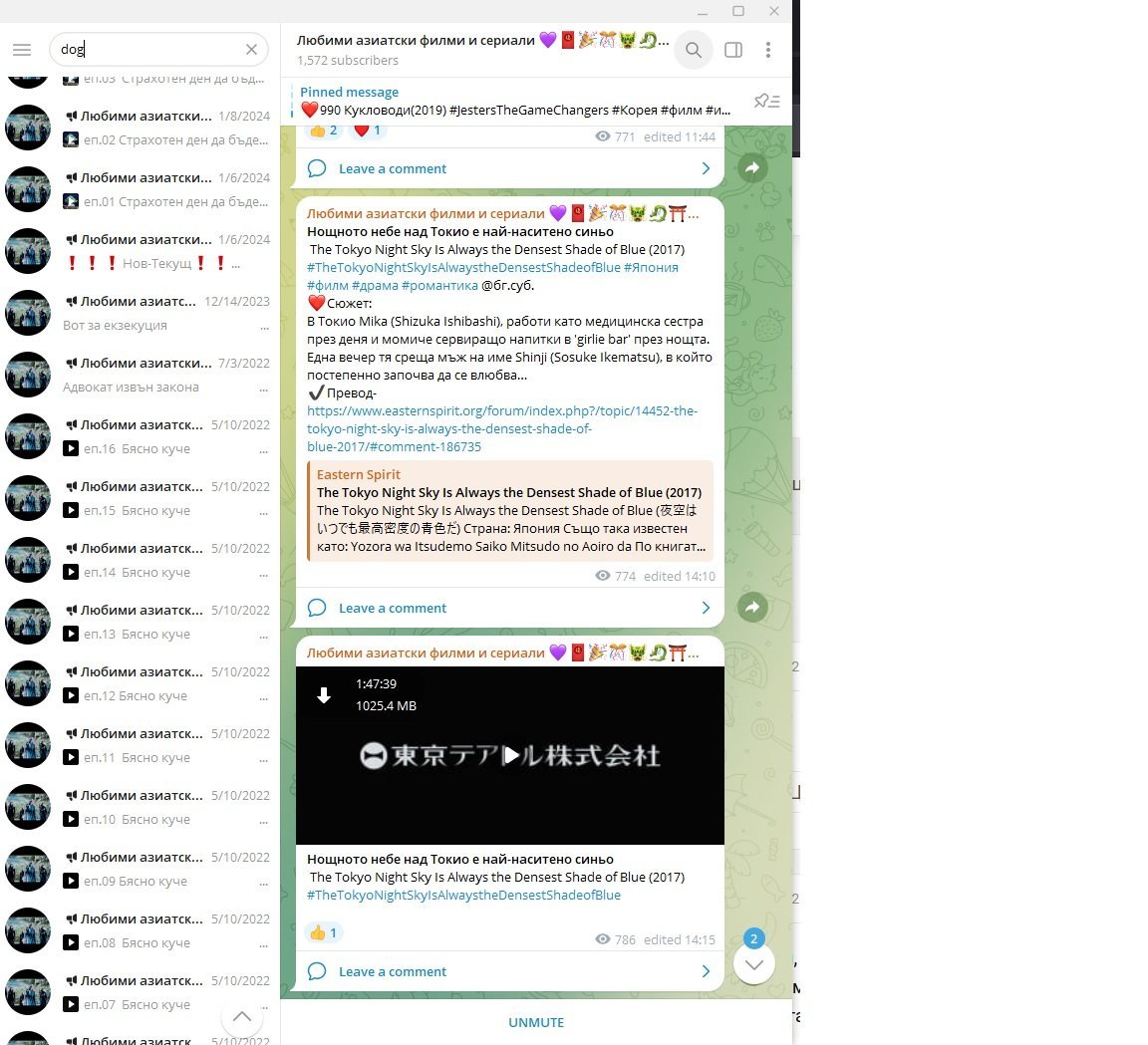 Бел, Криси, благодаря за разясненията. Отнасят се за настолната версия на Телеграм, нали? Понеже при мен на мобилната е малко по-различно, но като цяло доста лесно се намират нещата. От трите групи единствено с "Любими азиатски филми и сериали" ударих на камък, а точно там е онова, което ми трябва (Училището). След няколко неуспешни опита за лично успокоение ще си кажа, че и утре е ден 😂и ще се насоча към Плейтюб да понаваксам със сериала на Минка.